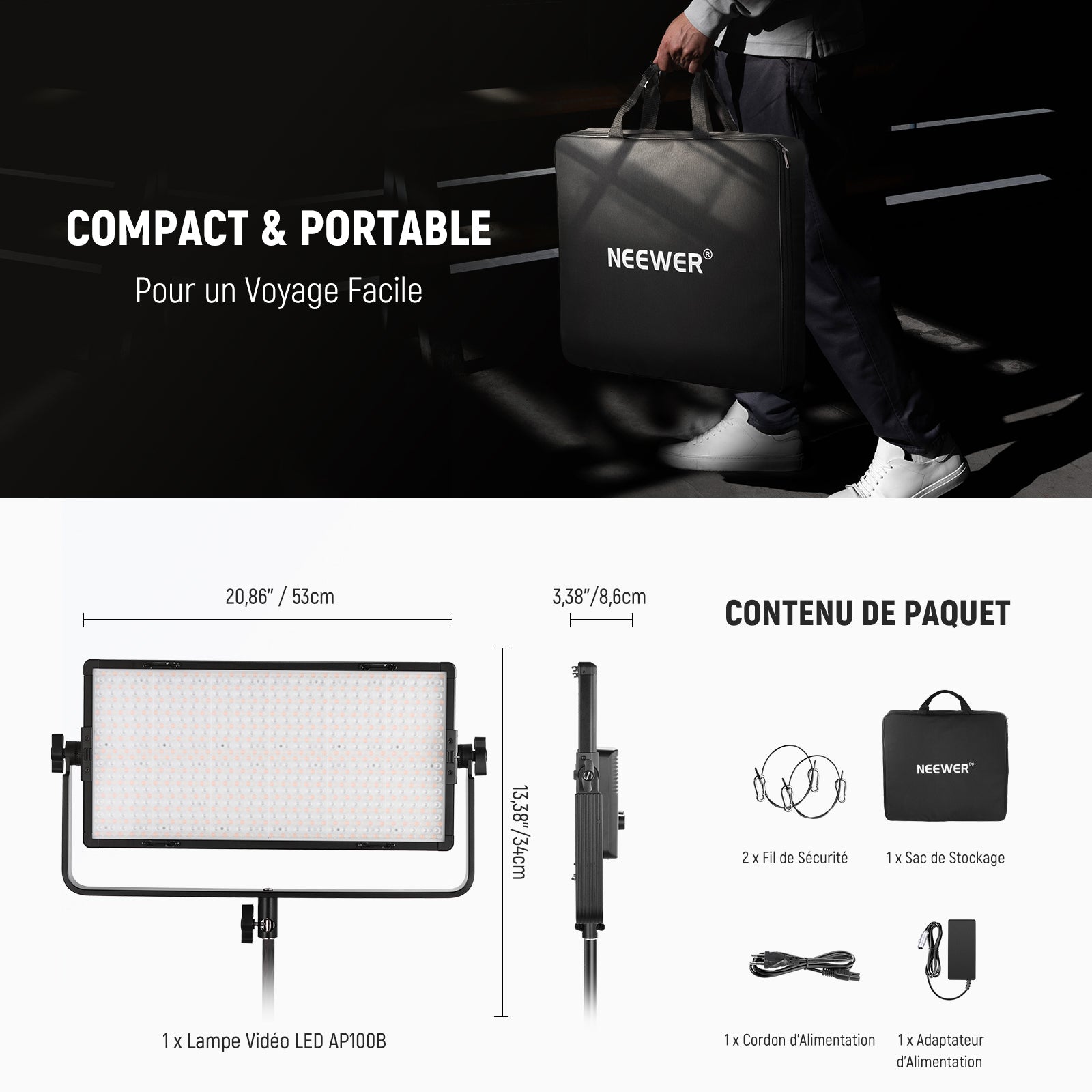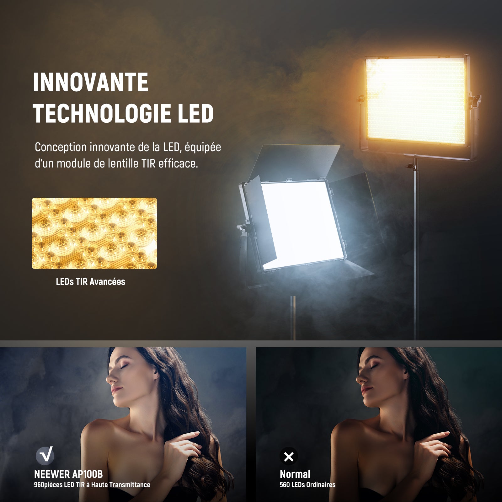 - 【Panneau Lumineux LED Bicolore 100W】 L'AP100B possède un design optique LED avancé et un module de lentille TIR pour une lumière intense et de qualité. Avec 960 LED, il offre 3860Lux@0,5m ou 12200Lux@1m à 6500K, avec un CRI de 96+ et un TLCI de plus de 97 pour une reproduction fidèle des couleurs. Passage du mode chaud au mode froid de 2500K à 8500K (par paliers de 100K). Idéal pour les podcasts vidéo, les photos en studio, les interviews, les photos de produits, les portraits, le streaming…