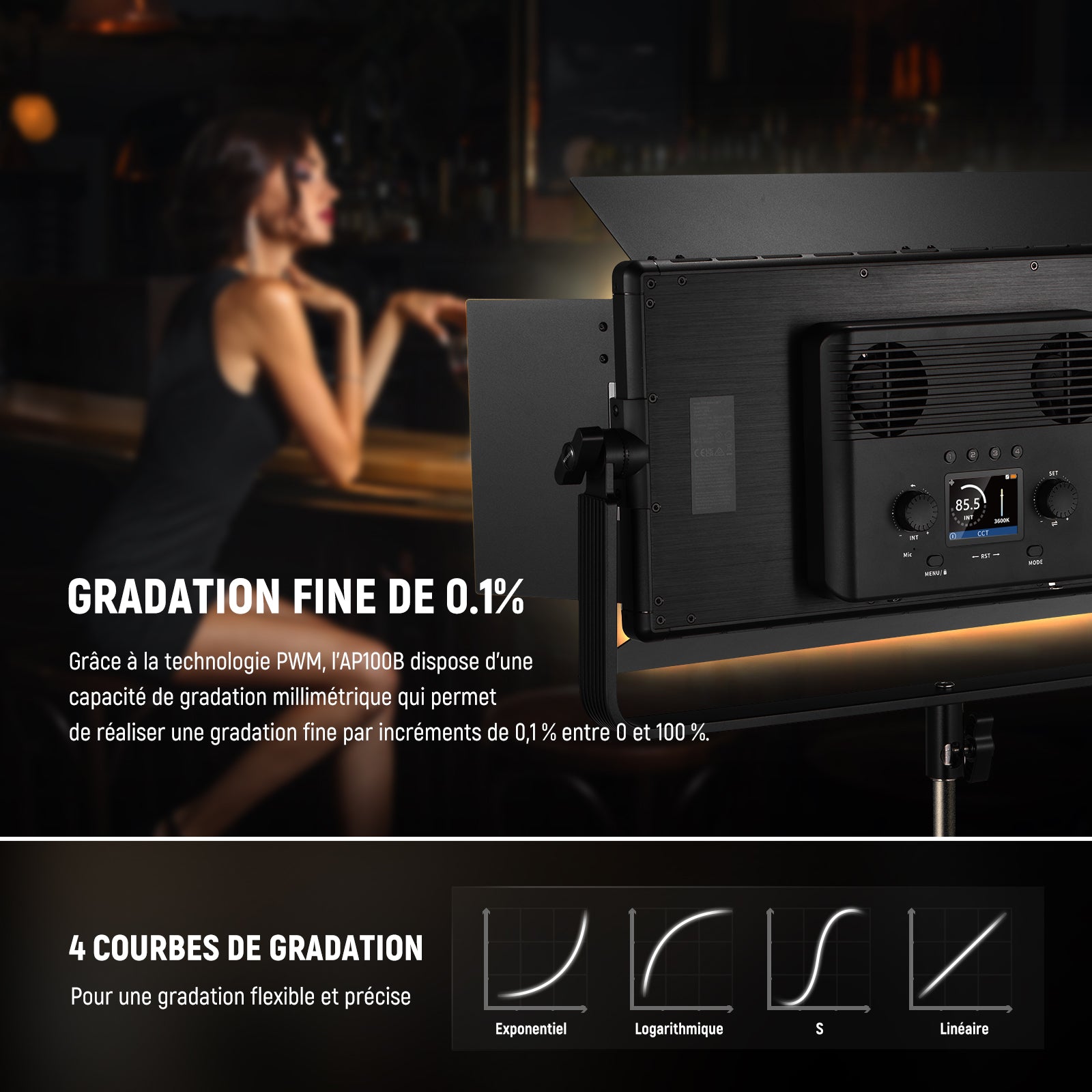 - 【3 Modes d'Éclairage】 L'AP150B offre 3 modes d'éclairage : CCT, FX & SOURCE. En mode CCT, vous pouvez régler la température de couleur de 2500K à 8500K (par paliers de 100K). Le mode FX a 13 effets de scène, le mode SOURCE offre 14 correspondances de sources. Grâce à la technologie PWM, l'éclairage cinéma AP150B permet un réglage précis de la luminosité 0-100% par paliers de 0,1%. Il propose 4 courbes de réglage (exponentielle, logarithmique, S, linéaire) pour des besoins d'éclairage variés