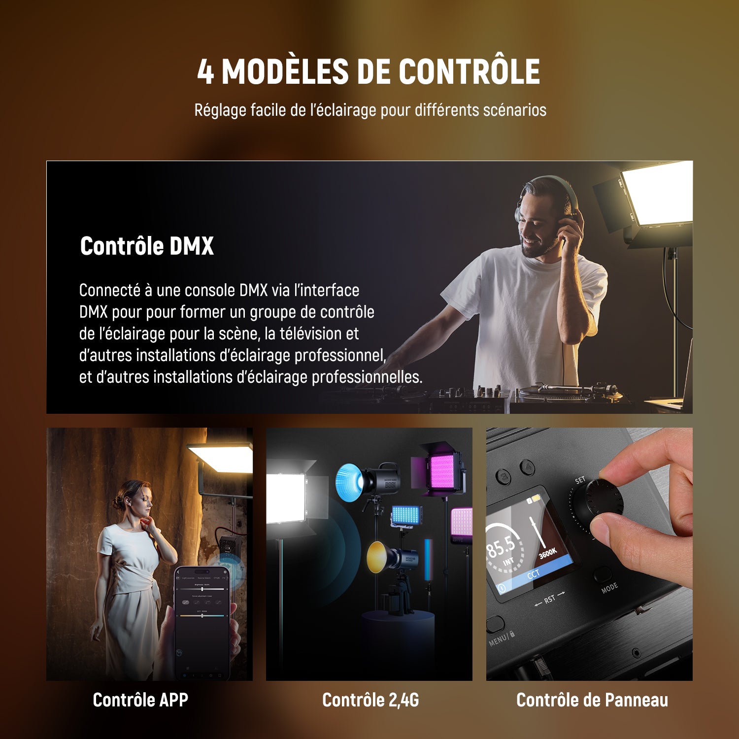 - Méthodes de contrôle : APP, 2.4G, panneau, contrôle DMX