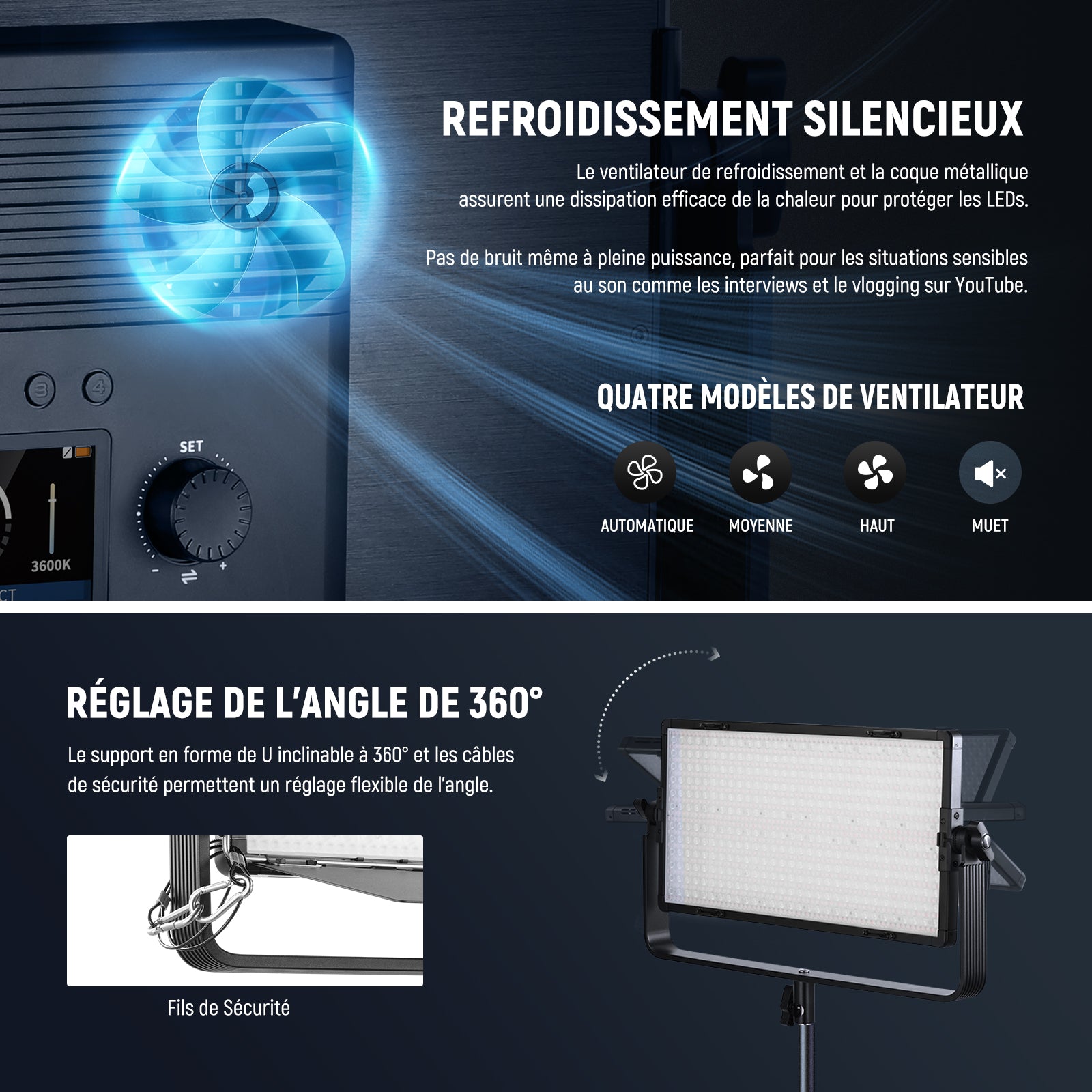 - 【Ventilateur de Refroidissement Silencieux & Mode FM Intelligent】 Cet éclairage possède un système de refroidissement super silencieux qui assure une puissance de sortie complète de 100% tout en réduisant le bruit du ventilateur. Il propose les modes Smart, Medium, High et Silent pour un environnement de prise de vue presque silencieux. Le solide corps en métal accélère la dissipation de la chaleur. Le mode FM intelligent ajuste la fréquence de la lumière pour éviter le scintillement