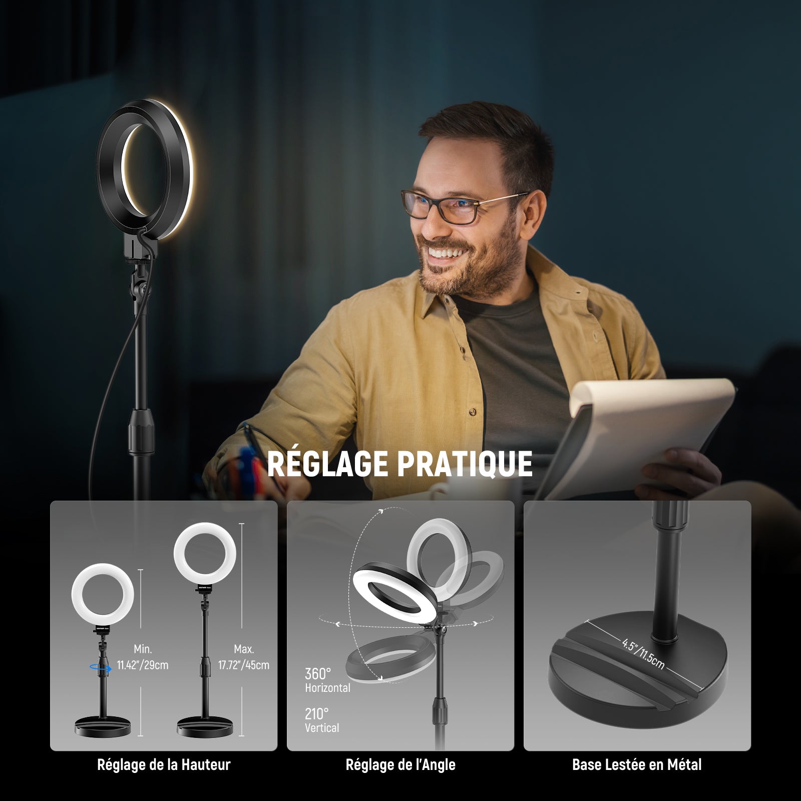 - 【Hauteur et angle réglables】 Le support de table s'ajuste en douceur de 29 à 45cm (11,42 à 17,72 pouces) et se verrouille solidement grâce à une molette, vous permettant de positionner l'anneau lumineux à la hauteur idéale. Sa base large, épaisse et robuste assure la stabilité et la sécurité de l'ensemble. De plus, le mini anneau lumineux LED halo pour téléphone s'incline d'avant en arrière, offrant des angles d'éclairage personnalisables pour une variété de configurations.