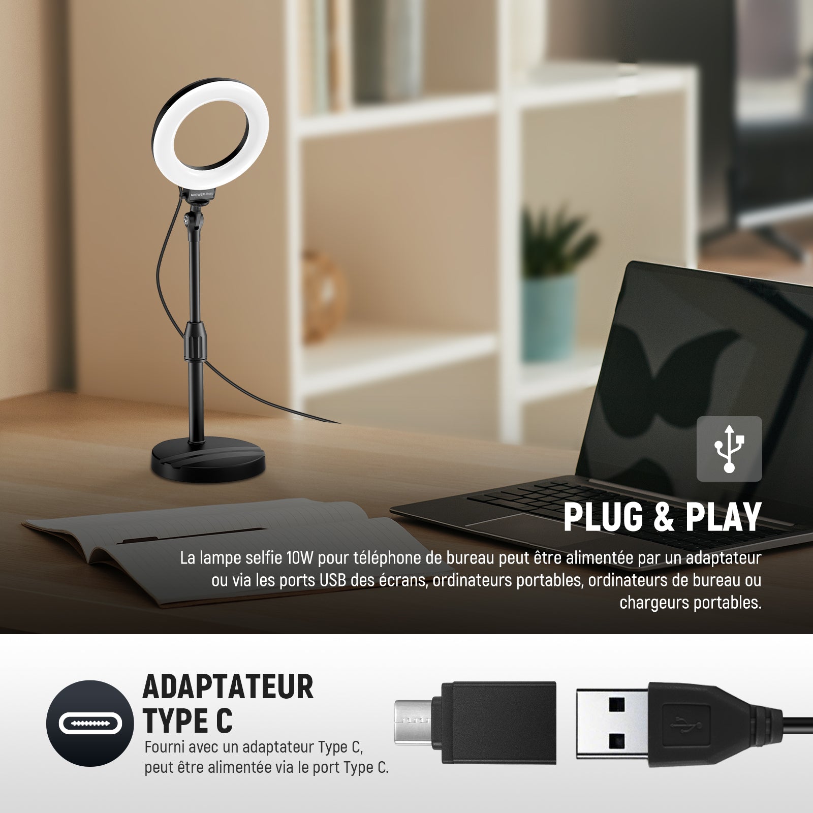 - 【Lampe LED selfie alimentée par USB】 Ce petit anneau lumineux LED professionnel de bureau de 10W fonctionne à 5V/2A et est équipé d'un câble de charge intégré de 1,8m. Il s'alimente facilement sur écrans, ordinateurs portables, chargeurs portables ou autres sources d'alimentation USB. Il offre ainsi des solutions d'alimentation flexibles pour la photographie, la vidéographie et un éclairage continu au quotidien.