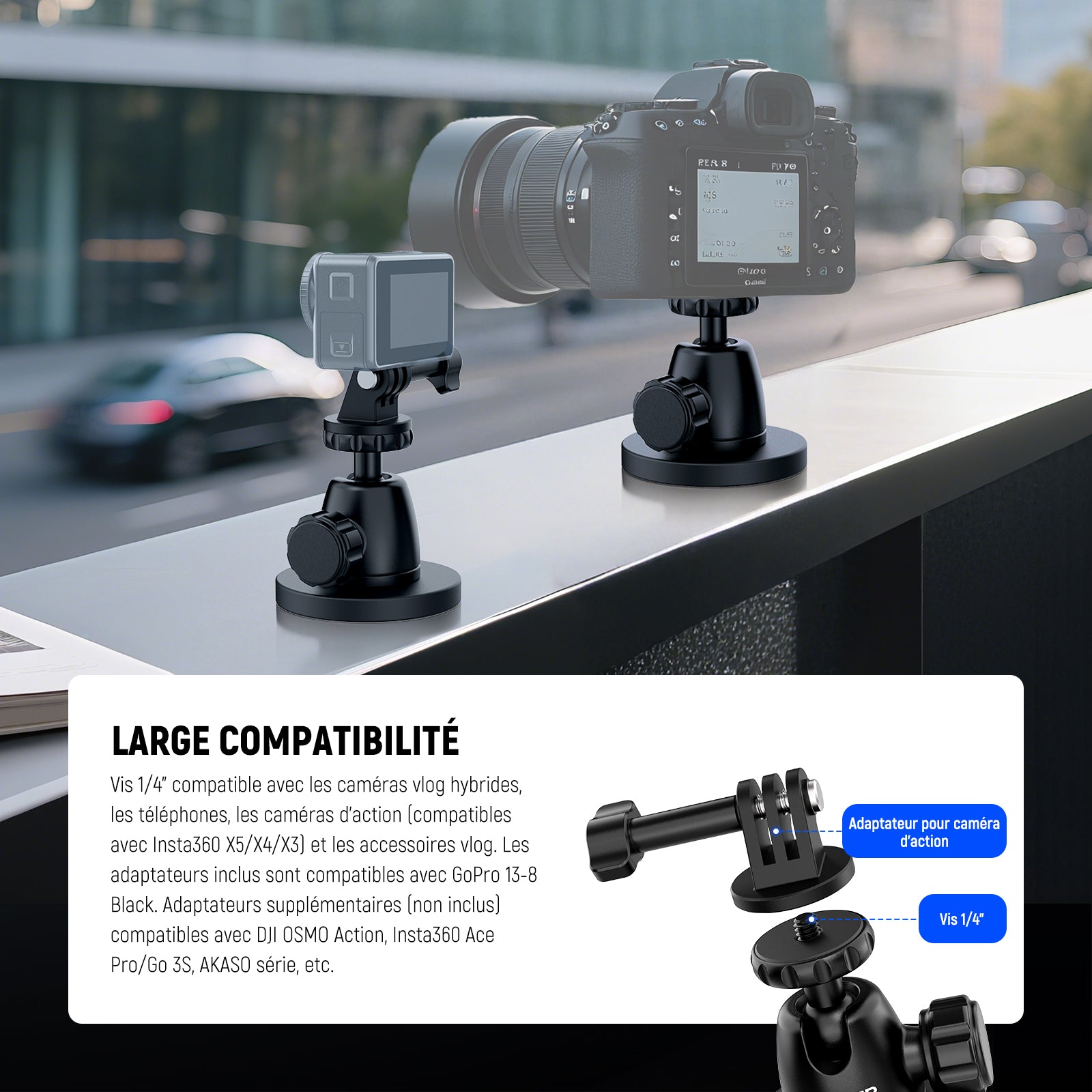 - Large compatibilité : la vis de 1/4" sur le support magnétique intérieur et extérieur de la voiture sert à fixer la caméra Vlog, la caméra d'action (compatible avec Insta360 X5 X4 X3) et d'autres accessoires de vlogging. Les supports pour caméra d'action sont inclus dans le kit, le paquet d'accessoires compatible avec GoPro 13 12 11 10 9 8 Black. Utilisez d'autres adaptateurs (non inclus) pour la compatibilité avec DJI Osmo Action 5 Pro 4 3 2 Insta 360 Ace Pro Go 3S AKASO Brave 8 7 EK7000 et plus encore