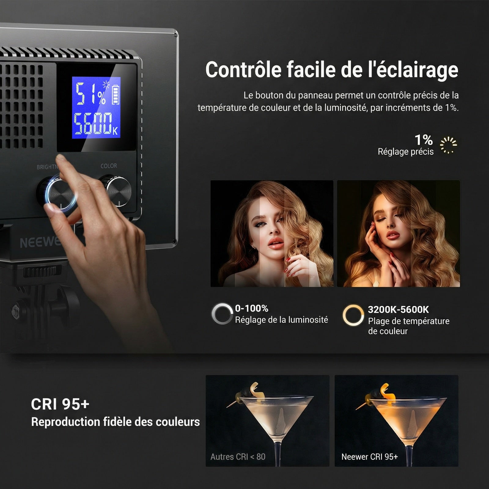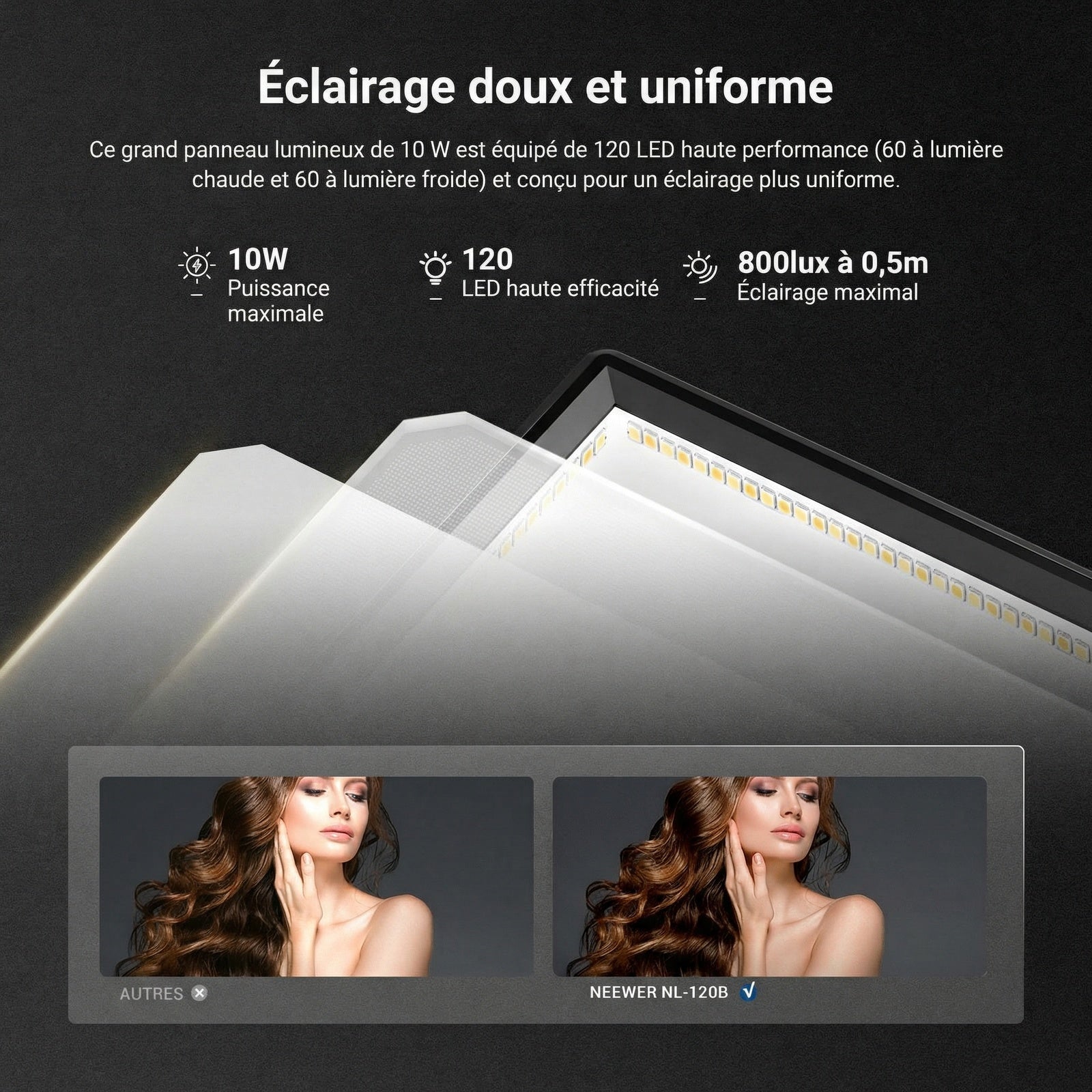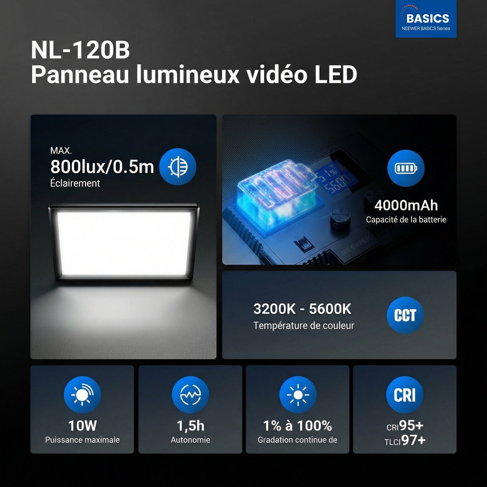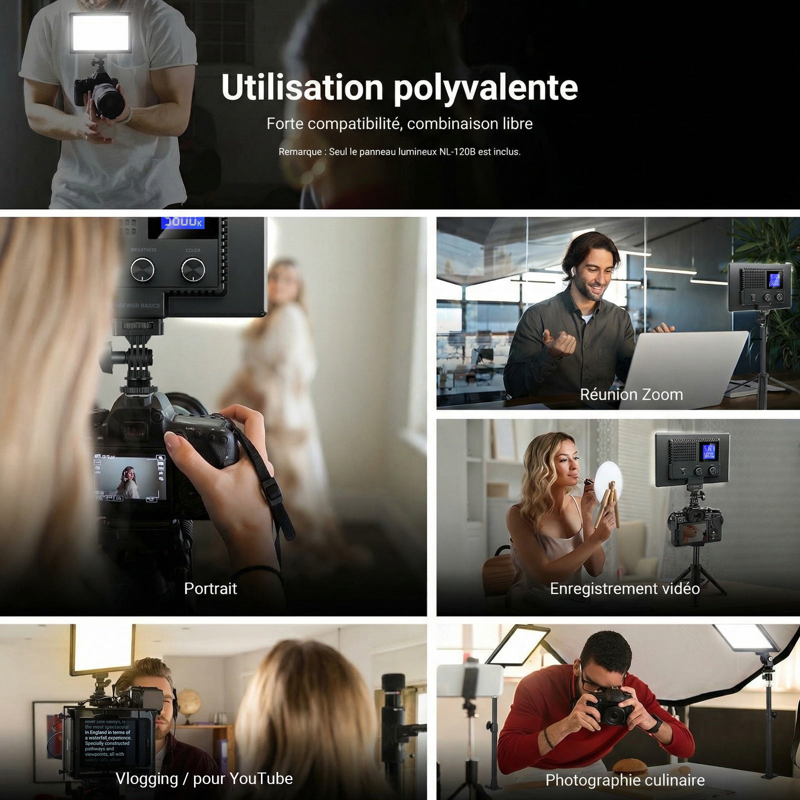 - 【Éclairage Bicolore avec gradation continue】Ce panneau d'éclairage continu NL-120Bl permet un réglage précis de la température de couleur de 3200K à 5600K et de la luminosité de 0 % à 100 % par paliers de 1 %. Idéal pour les créateurs sur réseaux sociaux,streamers et influenceurs,cet équipement est indispensable pour vidéos YouTube/TikTok,photographie culinaire,appels Zoom, tournages de maquillage,selfies,diffusions en direct,portraits,coiffeurs,vlogs,enregistrement de podcasts,etc.