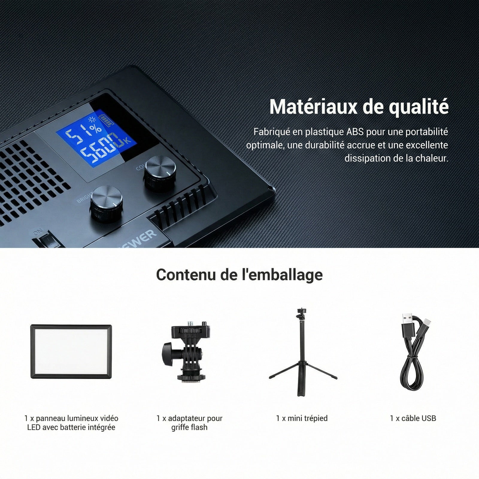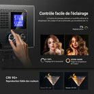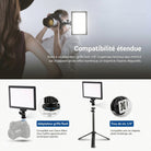 - 【Panneau LED 10W à éclairage périphérique à IRC élevé】9" panneau vidéo LED est équipé de 120 LED haute performance (60 LED chaudes et 60 LED froides) avec technologie d'éclairage périphérique,offrant un éclairage lumineux et agréable pour les yeux jusqu'à 800lux/0,5m.Son IRC élevé de 95+ garantit des couleurs fidèles à la réalité,garantissant des tons chair naturels sans distorsion.Idéal pour selfies, tutoriels maquillage et vidéos professionnelles.Remarque : Sac de transport non inclus.