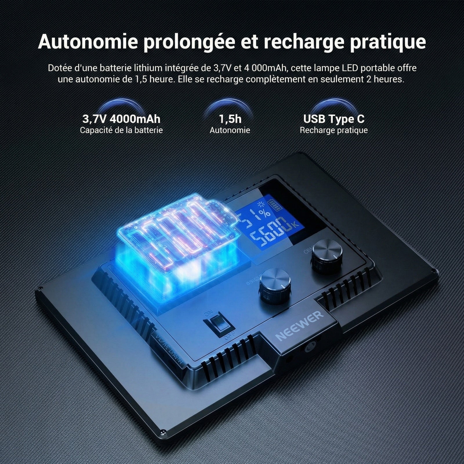 - 【Autonomie prolongée et recharge pratique】Équipée d'une batterie lithium intégrée de 3,7V et 4000mAh, cette lampe LED portable pour la photographie offre une autonomie d'éclairage de 1,5 heure. Elle se recharge complètement en seulement 2 heures et est compatible avec les ports USB et Type-C pour une recharge simplifiée. Un câble de charge USB Type-C est inclus pour plus de commodité.