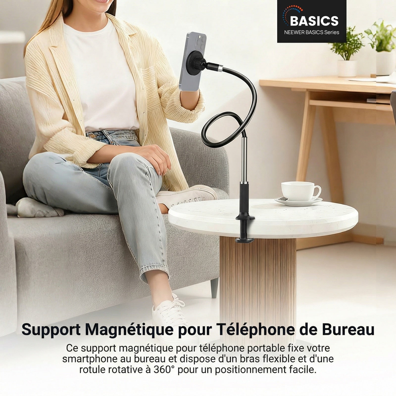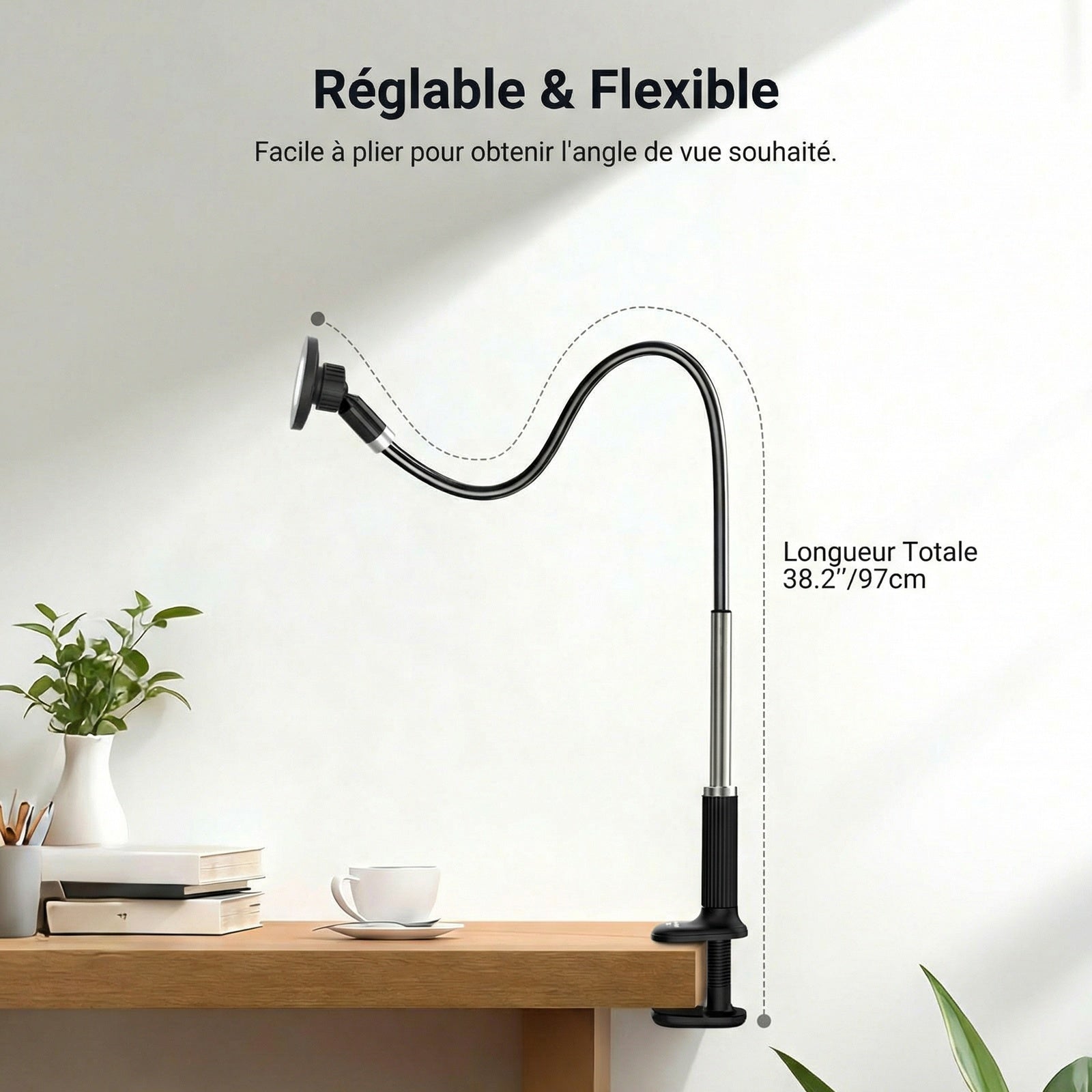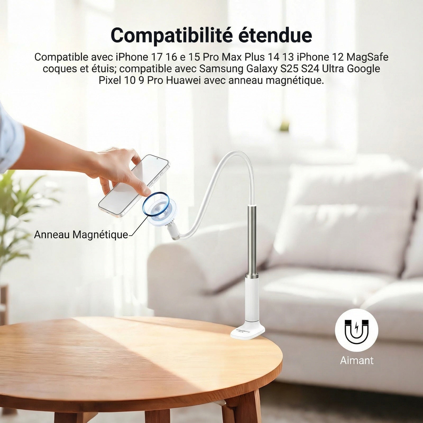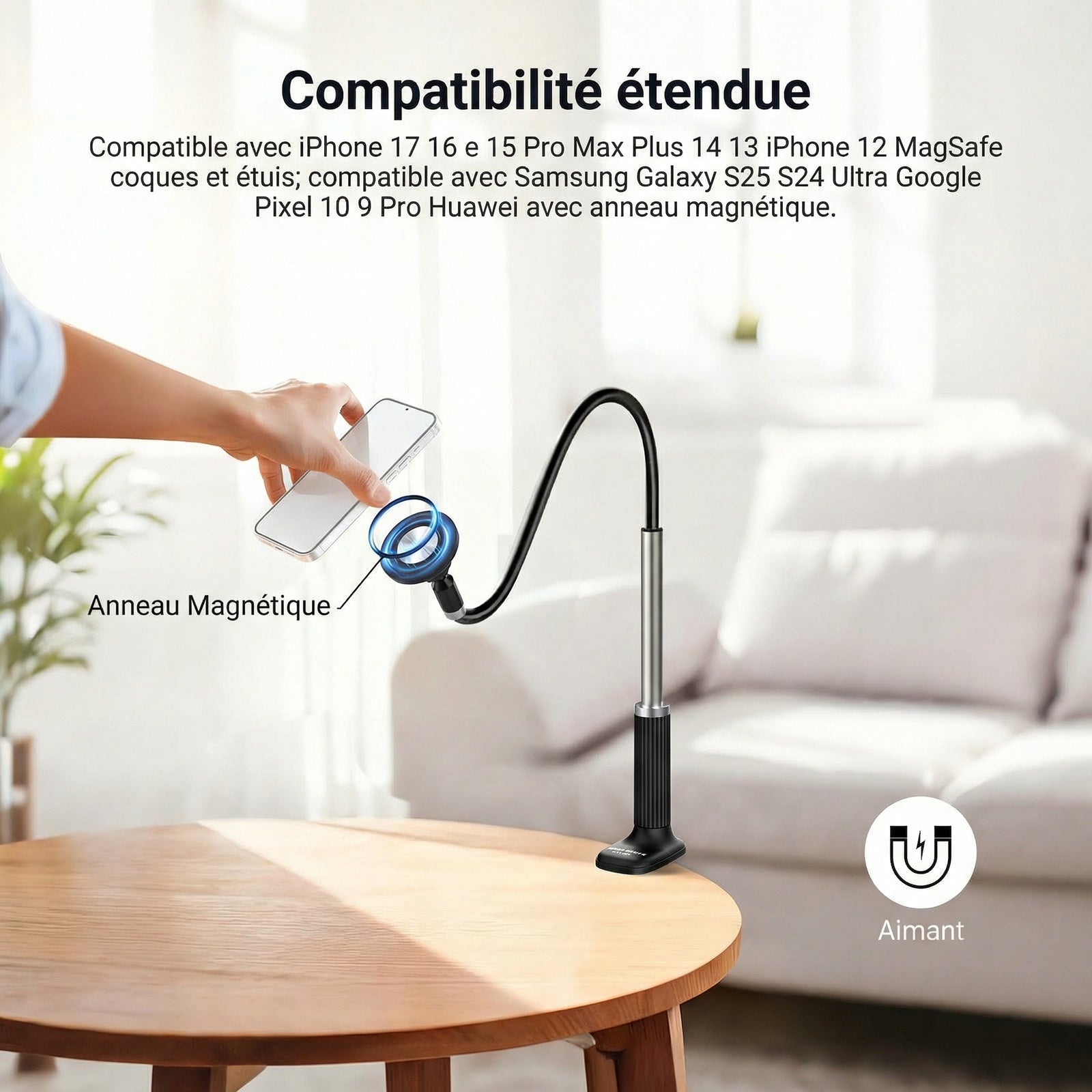 - 【Support magnétique pour téléphone avec bras flexible】 Ce support magnétique pour téléphone fixe votre smartphone au bureau grâce à un bras flexible et une rotule à 360° pour un positionnement facile