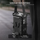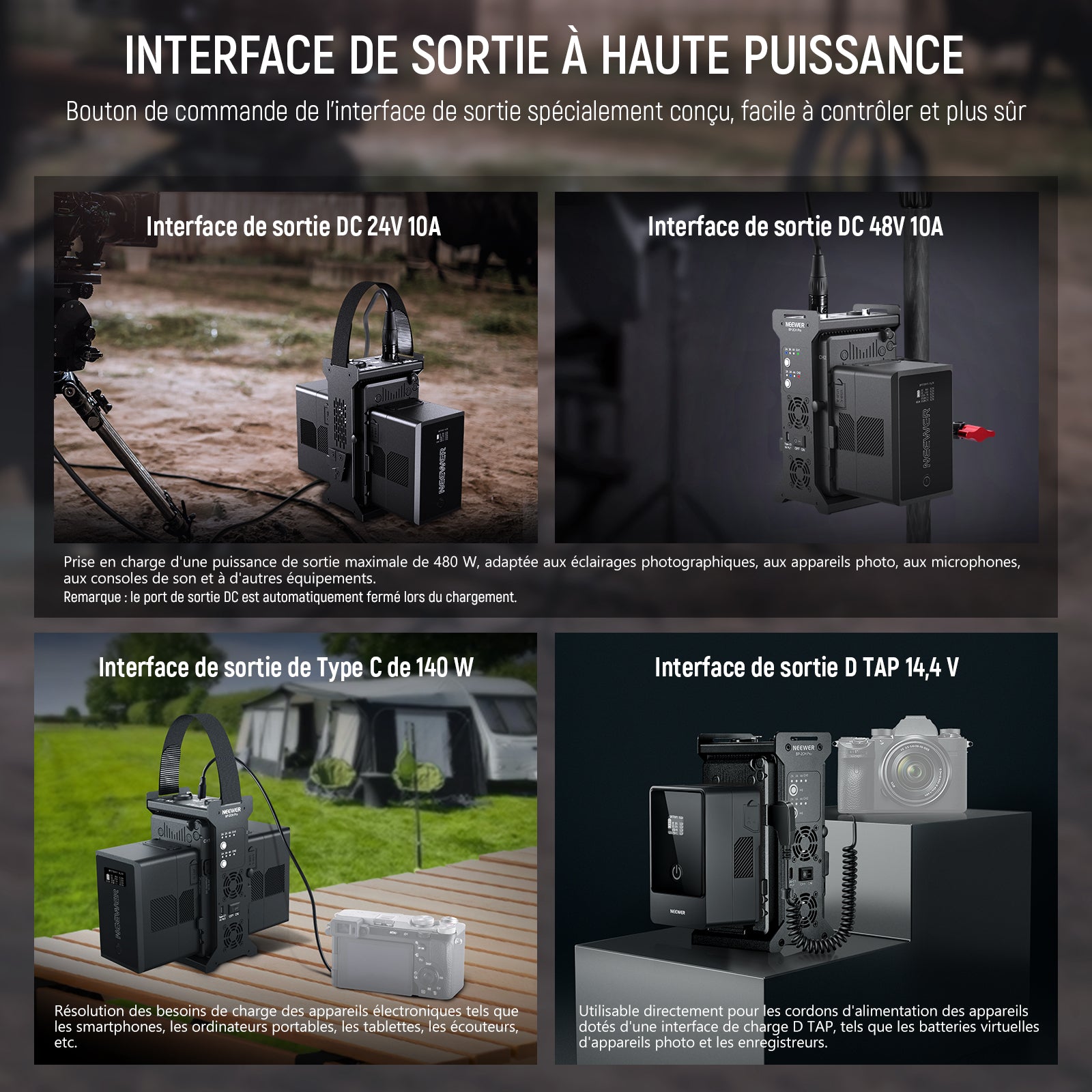 - 【Sorties Multiples】 Avec des ports DC 48V, DC 24V, 14,4V D-TAP, et 100W Type C, il alimente en continu les lampes vidéo LED, les flashs, les caméras, etc. Les ports DC disposent d'un interrupteur de contrôle distinct pour réduire les pertes de courant. Si la charge dépasse 200 W, 2 batteries V mount de plus de 100Wh sont exigées. Remarque : 2 batteries V mount doivent avoir une capacité identique, la tension de l'appareil connecté doit correspondre à celle du port de sortie correspondant