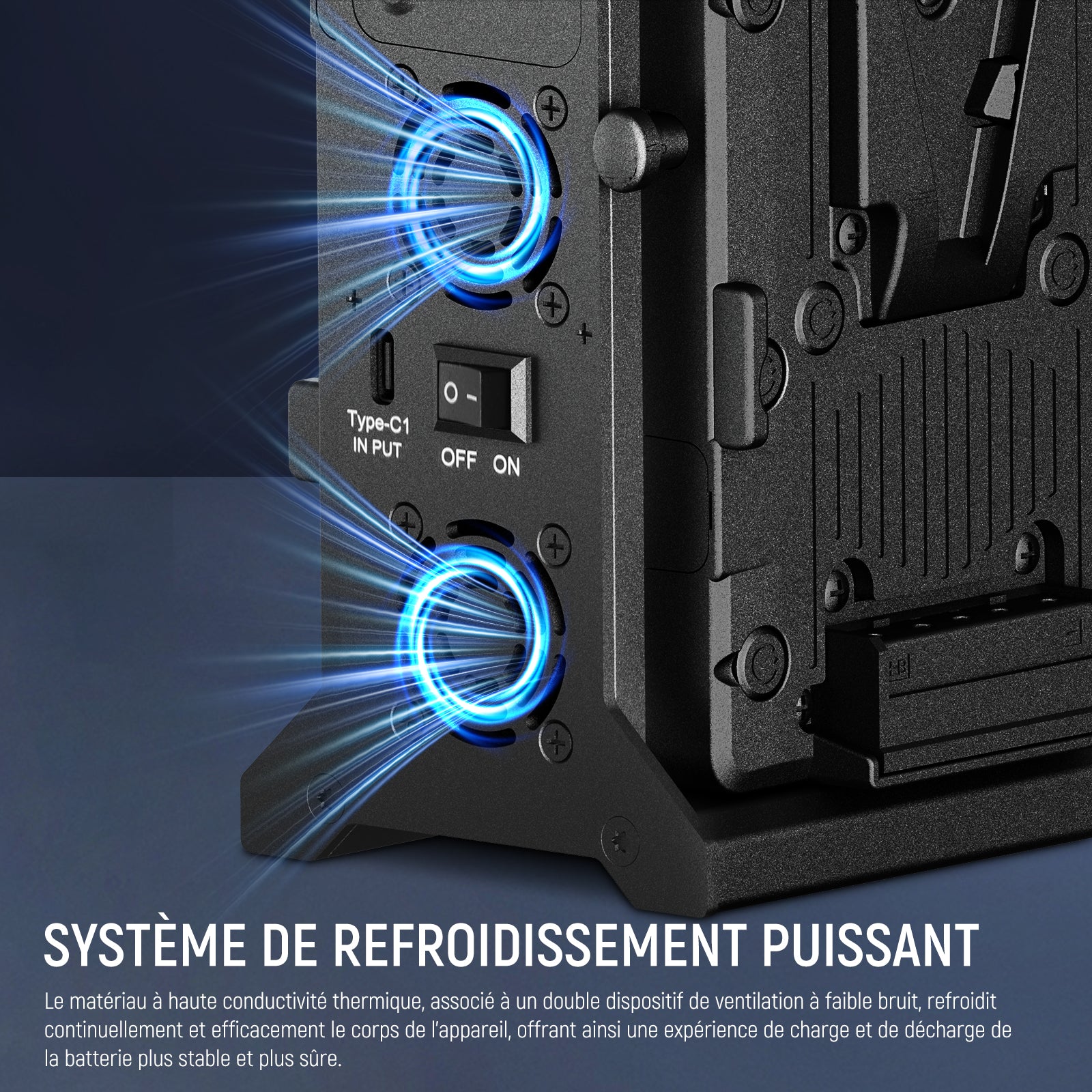 - 【Système de Refroidissement à Contrôle de Température】 Le chargeur de batterie V mount BP-2CH Pro est doté d'un noyau de gestion de circuit intelligent enfermé dans une coque en aluminium robuste. Le matériau à haute conductivité thermique, associé à des grilles creuses à refroidissement automatique et à deux ventilateurs puissants, dissipe efficacement la chaleur indésirable, améliorant la sécurité pendant l'utilisation et prolongeant la durée de vie de l'appareil