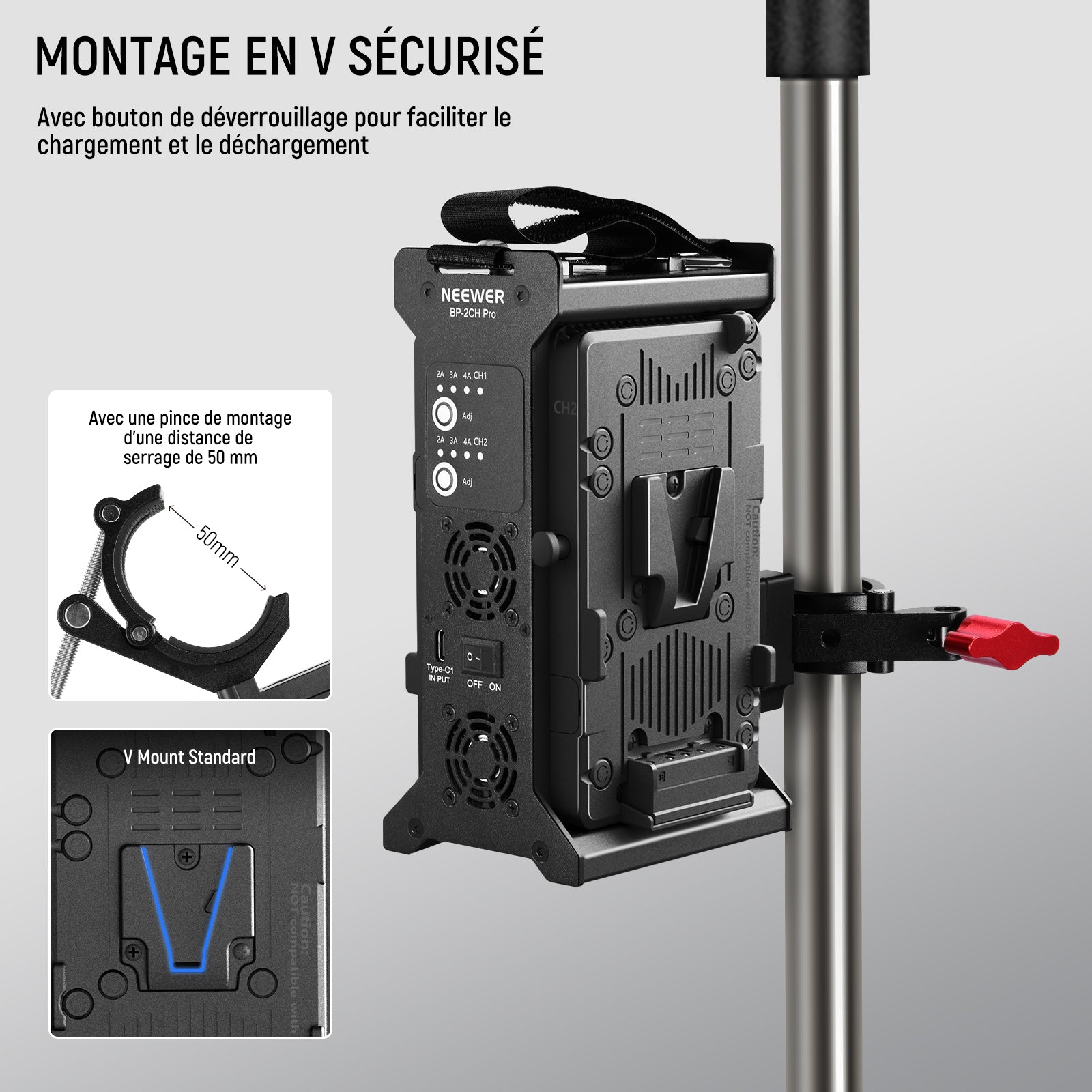 - 【Super Clamp & Câbles XLR】 Le kit de chargeur V mount inclut une super pince qui permet un montage rapide et peut se fixer en toute sécurité sur tout poteau d'un diamètre inférieur à 2"/50mm. Ce chargeur est doté d'un montage en V permettant de fixer la batterie ou d'autres appareils V mount. Il comprend également un câble XLR 3 broches (3m), un câble XLR 4 broches (3m) et un câble XLR 4 à 3 broches (30cm) pour l'installation de l'alimentation sans effort