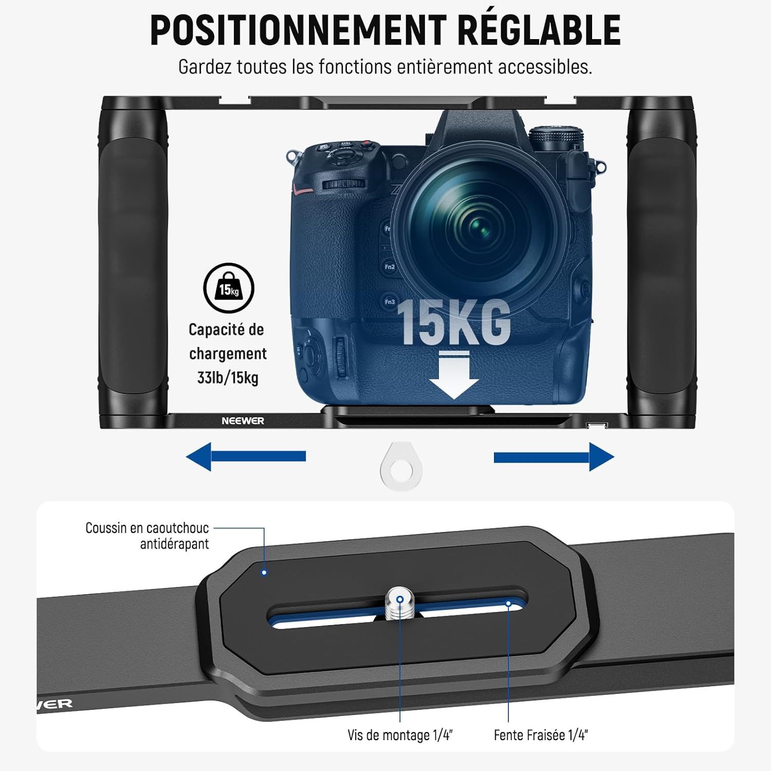 - 【Deux Poignées et Montage sur trépied】Les deux poignées ergonomiques avec texture en cuir synthétique et contours des doigts vous offrent une prise confortable et ferme sur la cage pour une prise de vue à main levée, ou montez-la sur une tête de trépied via les trous de vis de 1/4" sur le en bas, pour passer facilement de la prise de vue à main levée à la prise de vue sur trépied, grâce à sa base de type Arca