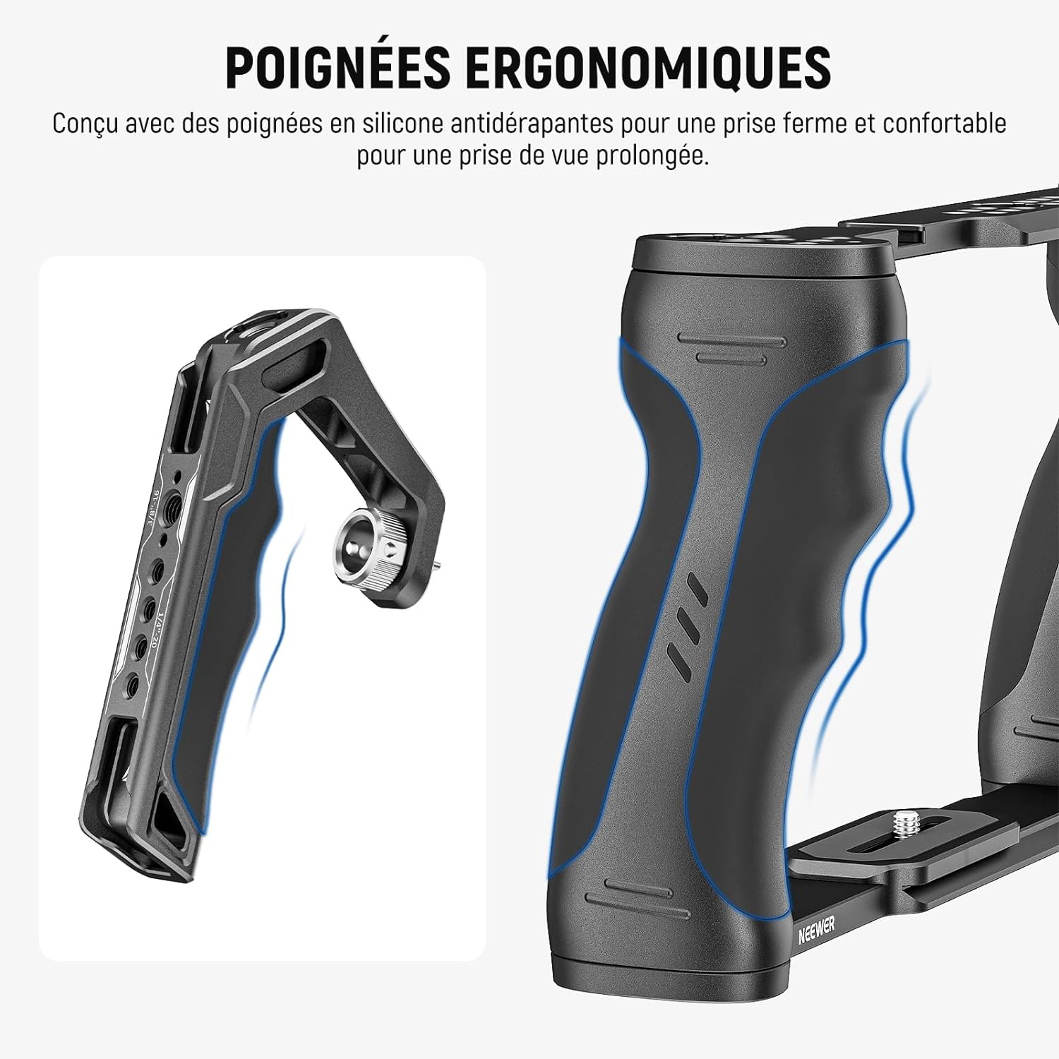 - 【Construction Solide et Légère】l'usinage CNC de précision et la poignée et la cage en aluminium léger offrent un alignement précis et un accès complet à la caméra. La poignée supérieure pèse 5,1oz/145g et supporte jusqu'à 22lb/10kg, tandis que la cage pèse 22,9oz/650g et peut contenir des équipements jusqu'à 33lb/15kg. La finition anodisée noire assure la durabilité en extérieur