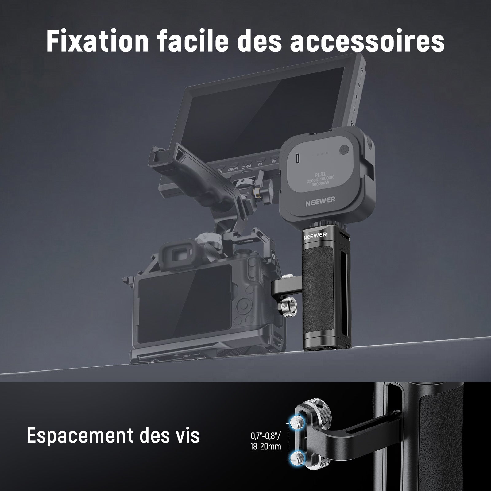 - 【Poignée latérale universelle légère】 cette poignée latérale compacte et légère se fixe à votre cage de caméra ou plate-forme vidéo via deux vis moletées de 1/4". Avec un espacement des vis réglable de 0,7" à 0,8" (18-20mm), elle est compatible avec SmallRig cages et Cages pour appareil photo NEEWER (CA020 CA019 CA014 CA011 CA002) et vous aide à stabiliser un appareil photo reflex numérique ou sans miroir jusqu'à 33 lb/15kg (non compatible avec Tilta)