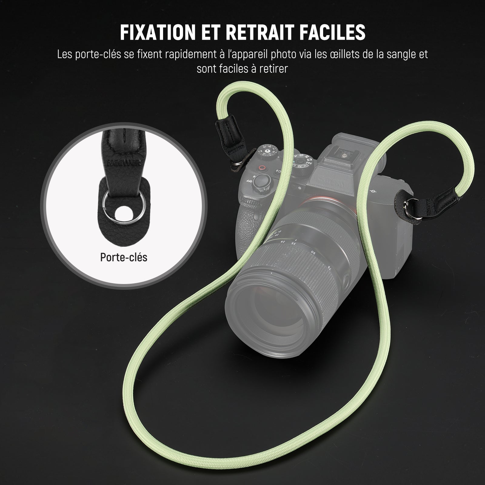- Fixation et retrait faciles- Les porte-clés se fixent rapidement à l'appareil photo via les œillets de la sangle et sont faciles à retirer