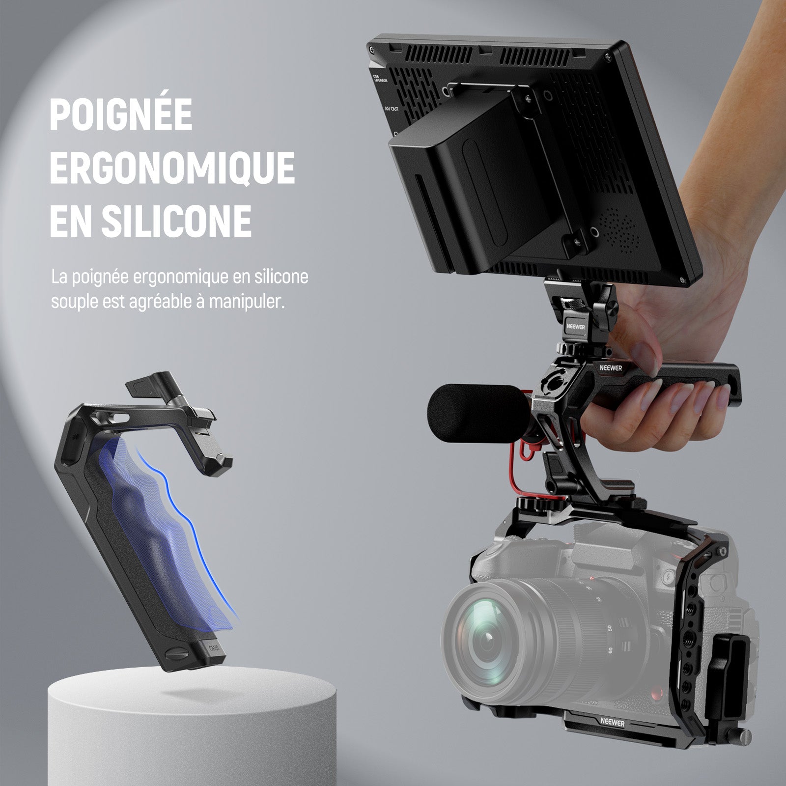 - Prise en main ergonomique en silicone souple : une poignée profilée en silicone offre confort et stabilité pour des prises de vue à faible angle lors de vos déplacements