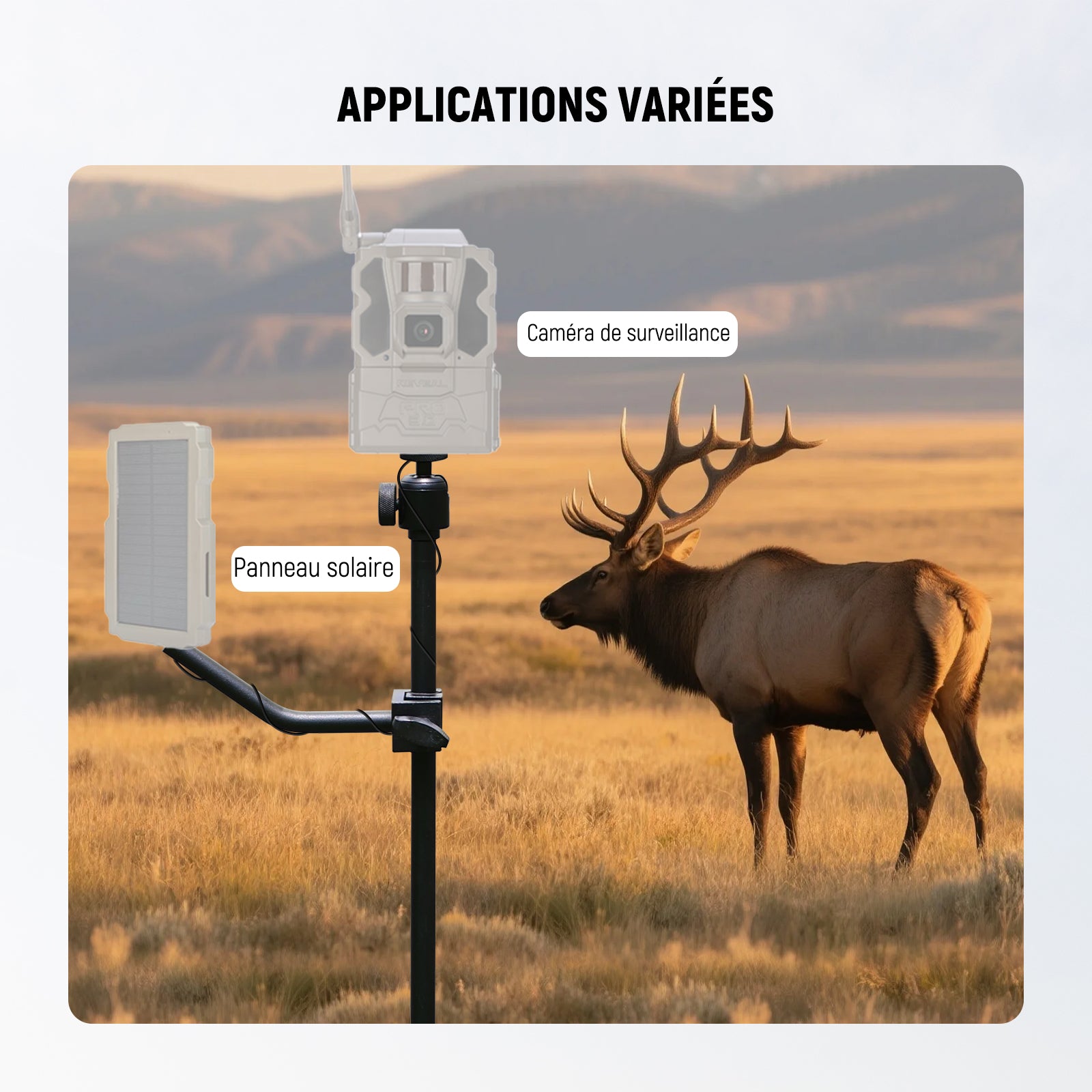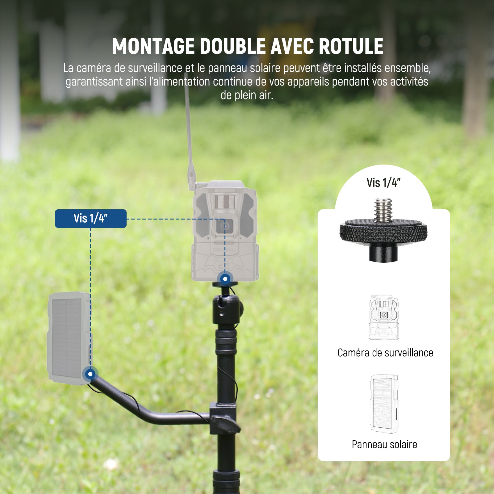 - 【Vis 1/4" et utilisation polyvalente】Avec 2 positions de montage,Ce support dispose d'une vis de montage 1/4", vous permettant de connecter 2 appareils simultanément.Vous pouvez installer une caméra et un panneau solaire, ou une lampe de pêche avec un panneau solaire, pour une alimentation continue de votre équipement pendant vos activités de plein air. Il permet d'installer 2 caméras pour des prises de vue sous-angles multiples, ou d'utiliser un télescope la nuit.