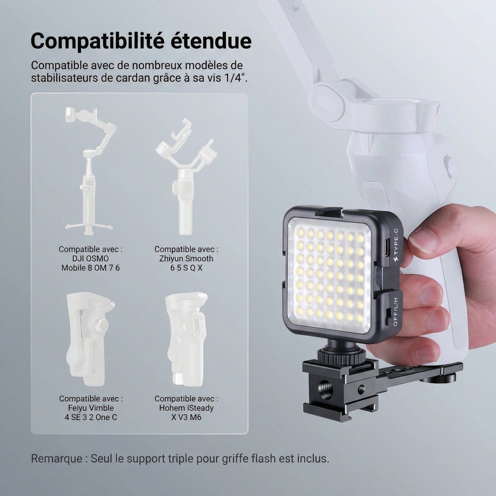 - 【Plaque d'extension triple pour griffe flash】 Fixez la plaque de montage avec ses trois griffes flash sous votre stabilisateur et ajoutez un microphone, une lampe LED ou un déclencheur de flash pour compléter votre configuration. Vous pouvez même les monter sur un trépied grâce à un pas de vis 1/4".