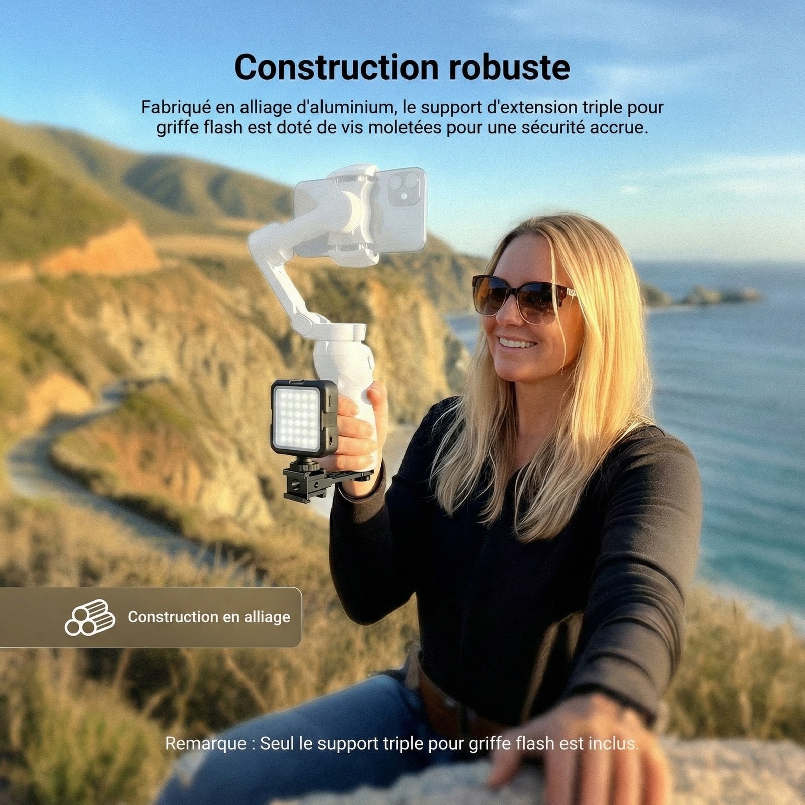 - 【Construction robuste et utilisation portable】 Fabriqué en alliage d'aluminium, le support d'extension triple griffe flash est doté de vis moletées pour une sécurité accrue. Son design fin et léger simplifie votre équipement de photographie mobile où que vous soyez.