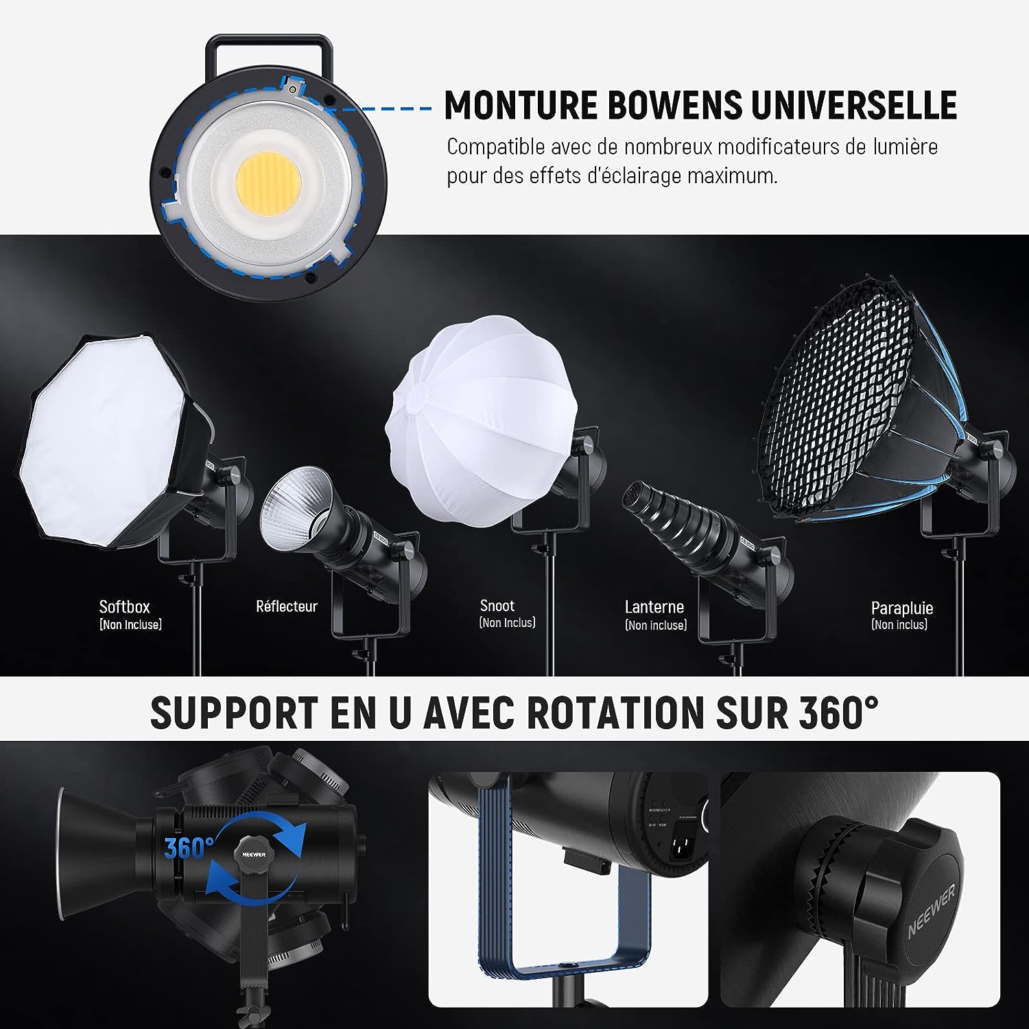 - Montage Polyvalent Et Support En U Amélioré- Le réflecteur standard avec surface intérieure argentée favorise l’homogénéité de la lumière délivrée. La monture Bowens permet de fixer différents modificateurs de lumière tels que des réflecteurs, des softboxes et des bols beauté. Le support en U amélioré assure un réglage du faisceau sur 360°. La molette à friction plus grande améliore le maintien de l'angle de la lumière. La fixation pour parapluie se situe en dessous l’éclairage.