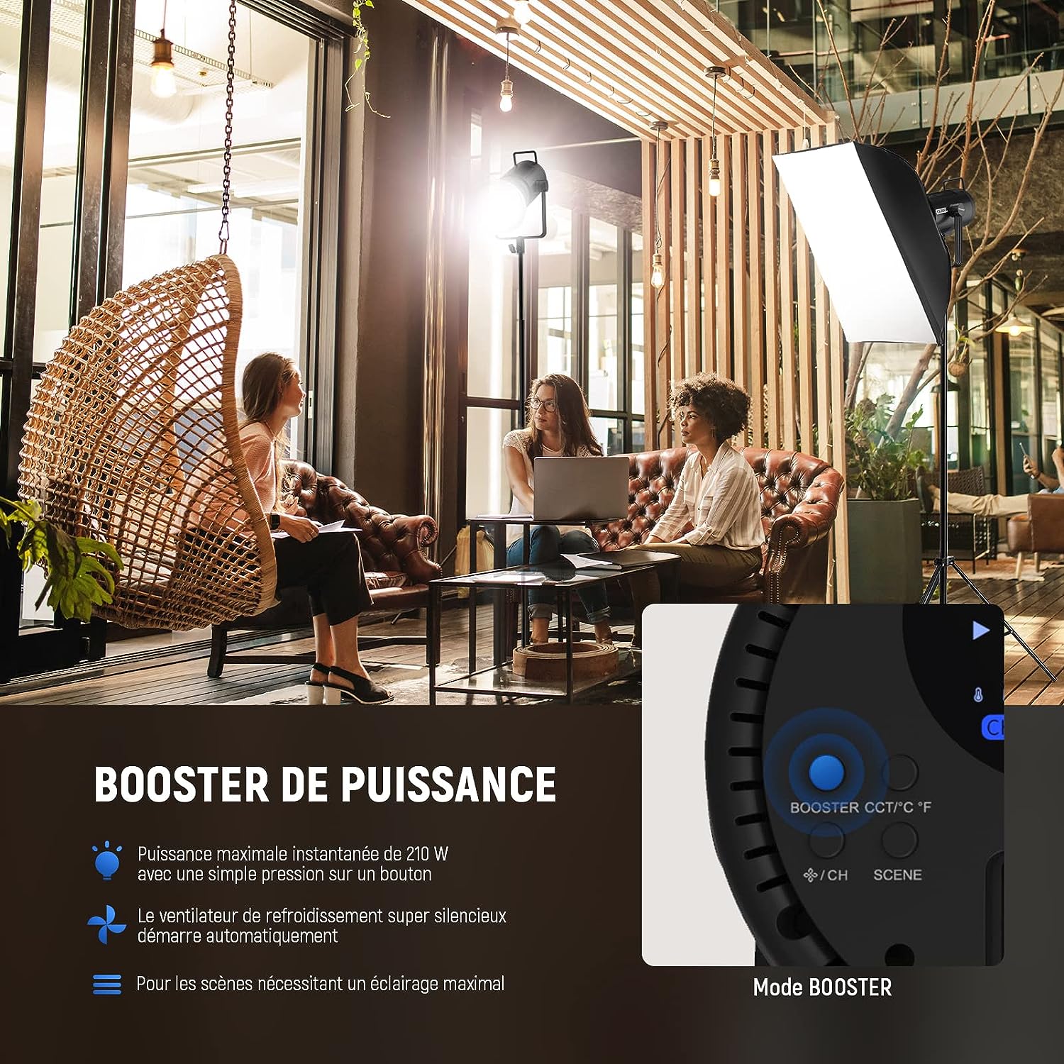 - 12 Effets d'Éclairage/Silence/Mode Booster- 12 effets d'éclairage sont préréglés pour ajouter des éléments accrocheurs à vos créations vidéo. Il est équipé du mode Booster à un bouton qui peut fournir environ 210W de puissance et 90000Lux/1m et active automatiquement le ventilateur pour améliorer la dissipation de la chaleur. Le mode silencieux offre une puissance d'environ 60W et 30000Lux/1m, le ventilateur reste éteint ce qui est particulièrement adapté à la photo d'enfants ou d'animaux