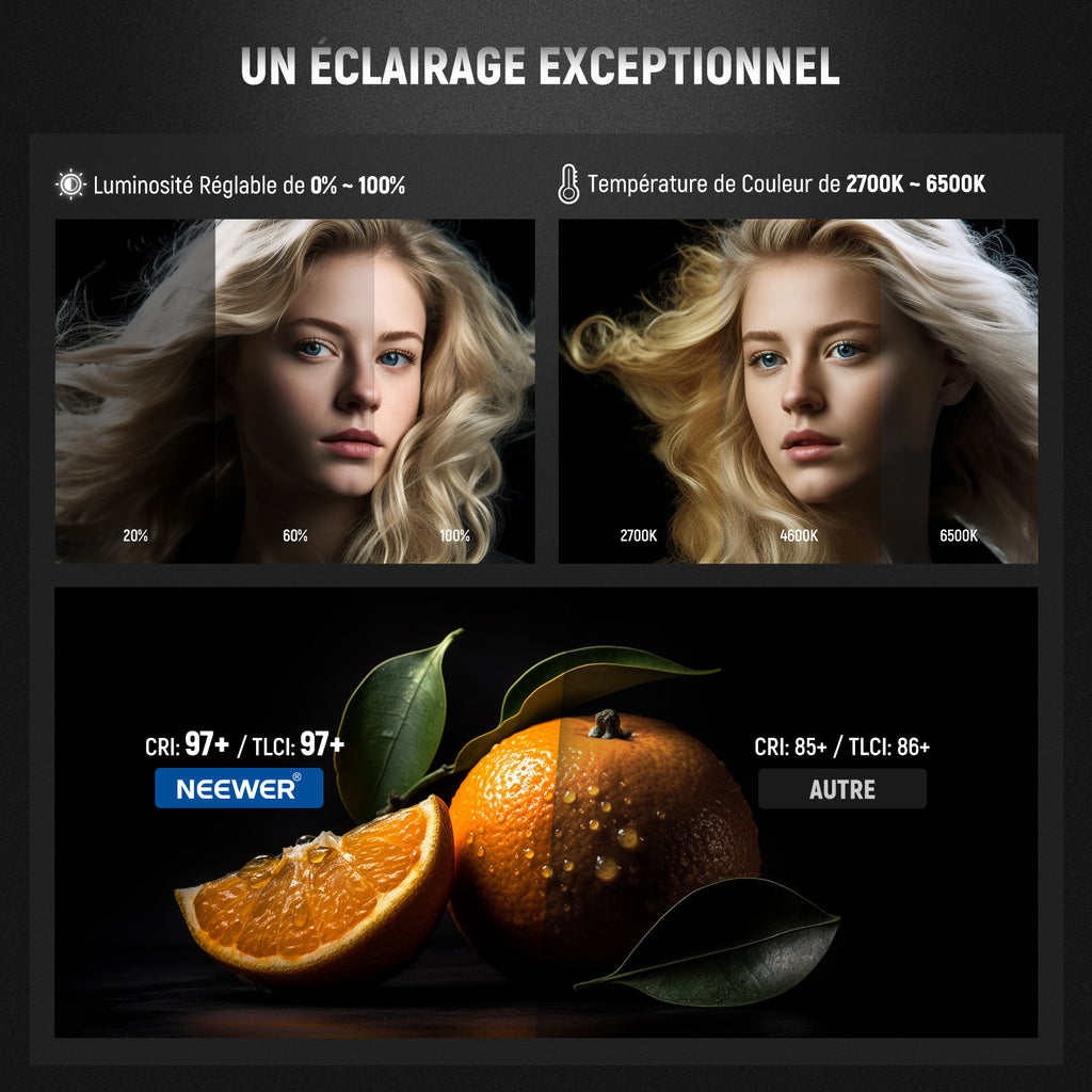 - 2700K-6500K CCT & 12 Effets de Scène- Fournit 2 modes d'éclairage: mode CCT et mode scène. Offre une température de couleur de 2700K à 6500K, une plage de gradation de 0 à 100 % et des options de lumière du jour ou chaude pour votre œuvre créatif. 12 scènes d'éclairage personnalisées donnent un éclairage réaliste sur le tournage, ce qui vous permet d'économiser plus de temps de post production. CRI élevé 97+ et TLCI 98+ garantissent une reproduction précise des couleurs.