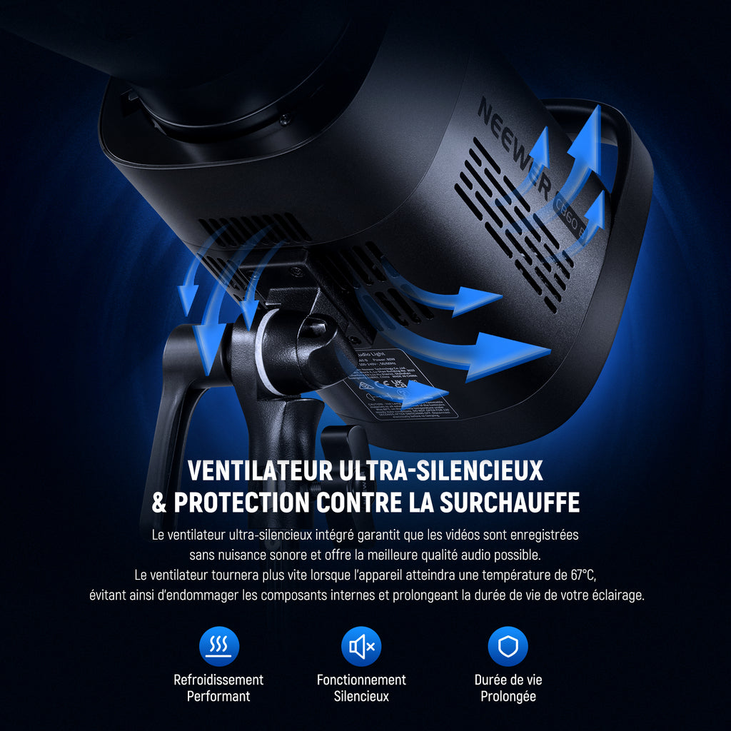 - Ventilateur Ultra Silencieux et Protection contre la Surchauffe- Le ventilateur ultra silencieux intégré garantit que les vidéos sont tournées sans trop de distractions sonores et donne la meilleure qualité audio plus possible. De plus, le ventilateur de refroidissement intégré fonctionnera plus rapidement une fois que la lumière atteint une température de 152°F/67°C, en cas de dommages aux composants internes, prolongeant la durée de vie de la lumière.