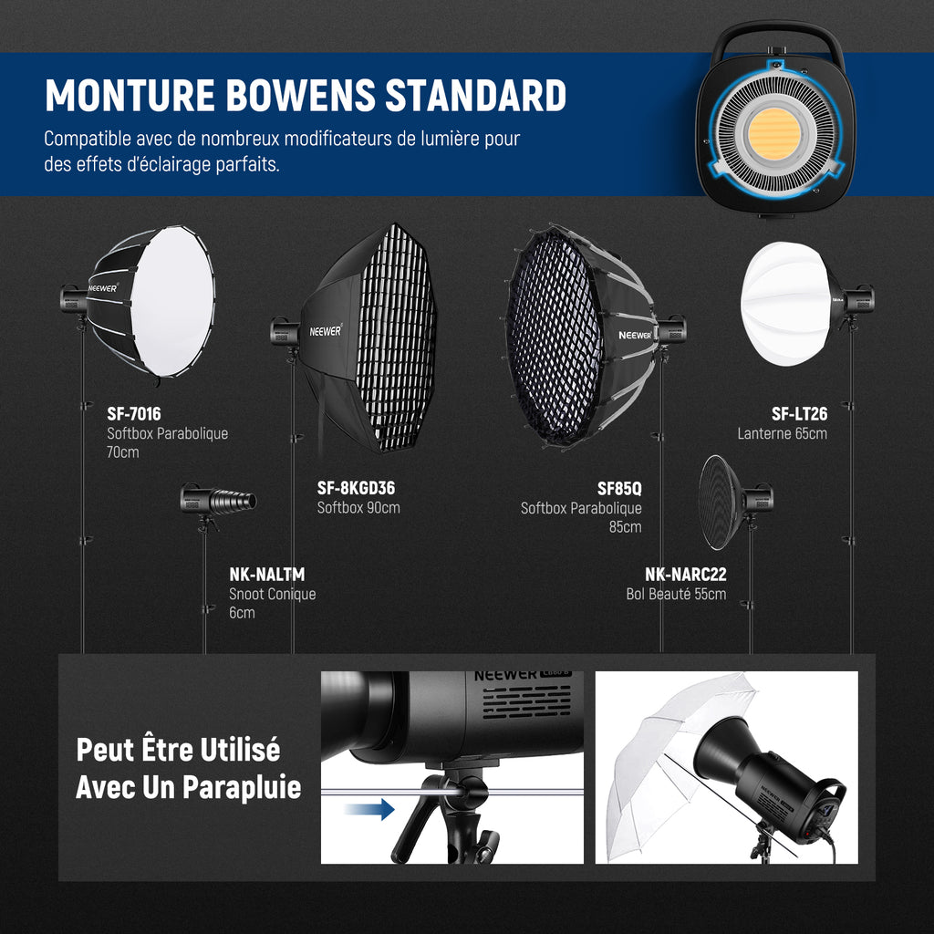 - Bowens Mount et Compatibilité Plus Large- Avec Bowens Mount standard et trou de parapluie intégré. Compatible avec NEEWER une grande variété de modificateurs de lumière, y compris les softbox, les réflecteurs, les plats de beauté, les snoots, les parapluies, etc. Le support peut être incliné à 180° en douceur pour un réglage facile des angles d'éclairage avec un bouton de verrouillage, afin de fixer fermement la lumière sur un support d'éclairage.