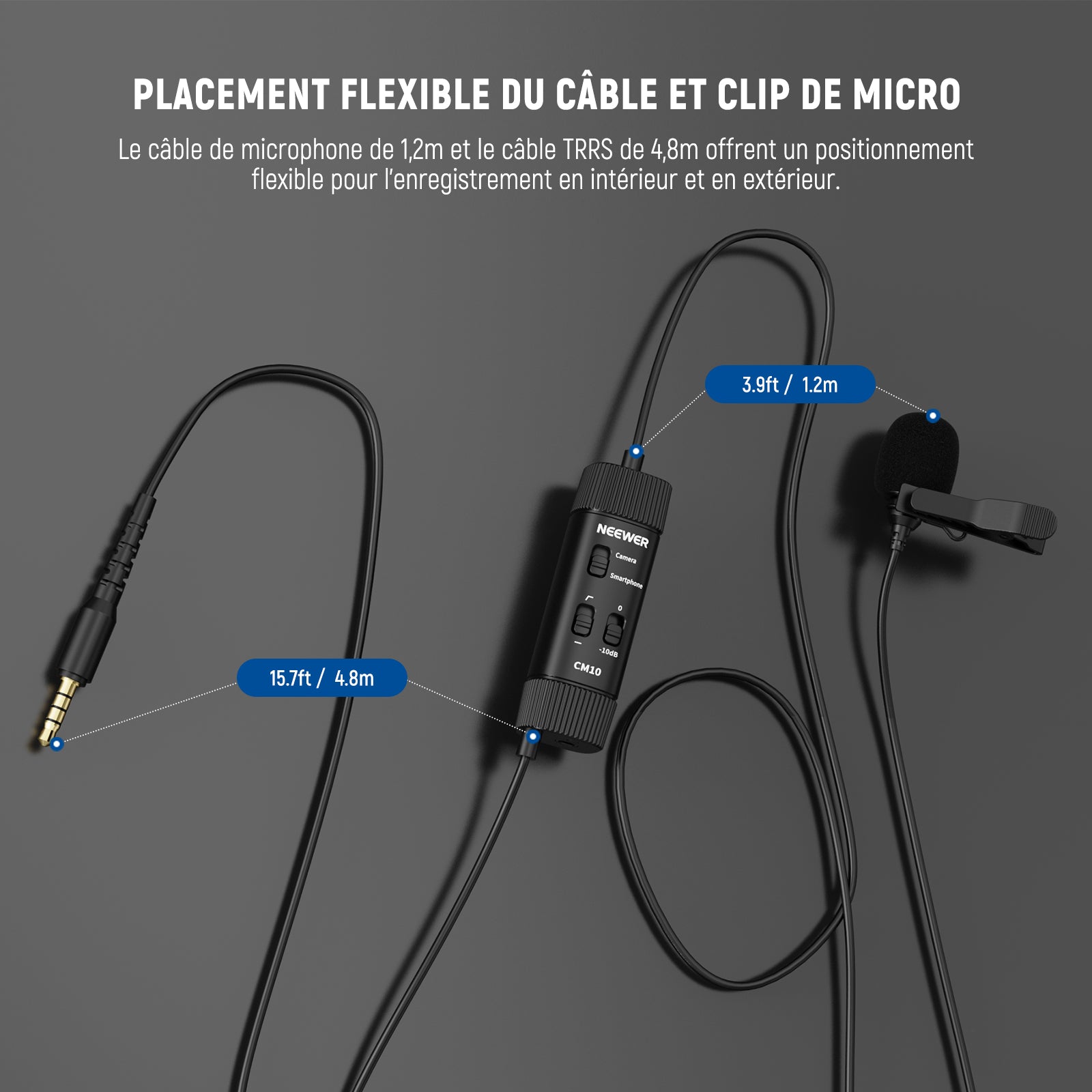 • 【Placement de câble flexible et clip de micro】 Le câble de microphone de 1,5m et le câble TRRS de 4,5m offrent un positionnement flexible pour l'enregistrement en intérieur et en extérieur. Le petit clip micro attache solidement le petit microphone portable et portable à votre collier sans le faire s'affaisser
