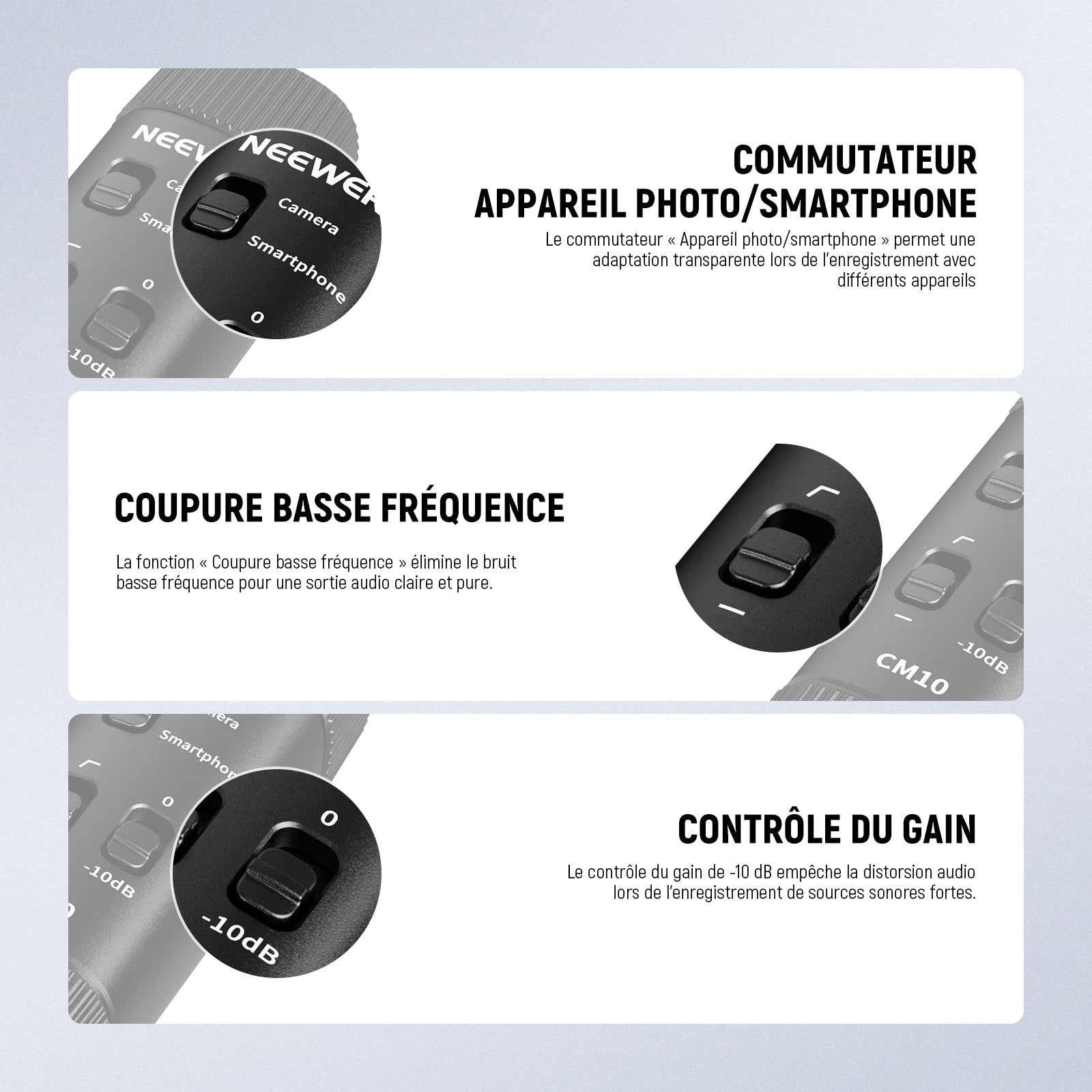 • 【Contrôle de gain et de coupure basse fréquence】 La fonction « coupure basse fréquence » élimine le bruit basse fréquence pour une sortie audio claire et pure. Et le contrôle de gain de -10 dB empêche la distorsion audio lors de l'enregistrement de sources sonores fortes