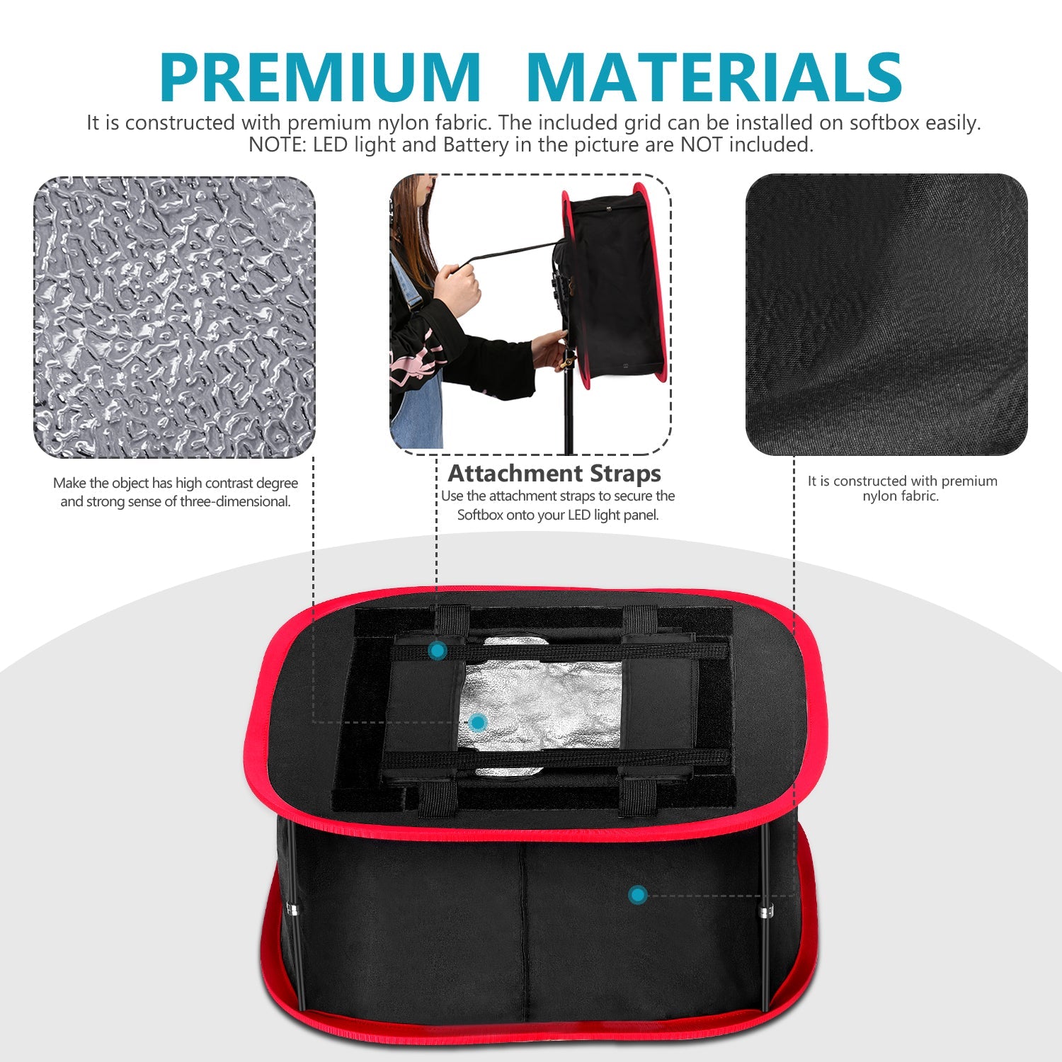 - DIMENSIONS ET MULTI-USAGE- La taille de la boîte à lumière après son apparition est de 40,3x40,3x15,8 cm avec une ouverture de 23,5x21 cm pour fixer le panneau d'éclairage à LED. Cela ne concerne pas seulement Neewer 660 LED panneau, mais également Neewer 480/530 LED panneau; vous offrant plus de choix de panneaux LED. REMARQUE: veuillez mesurer la taille de votre panneau LED avant de commander
