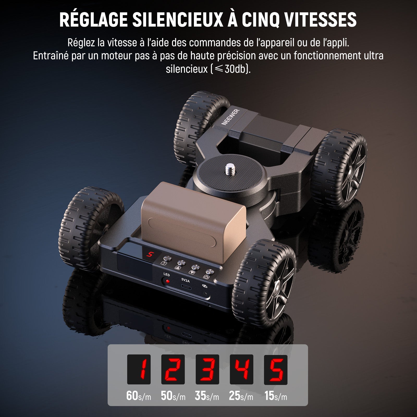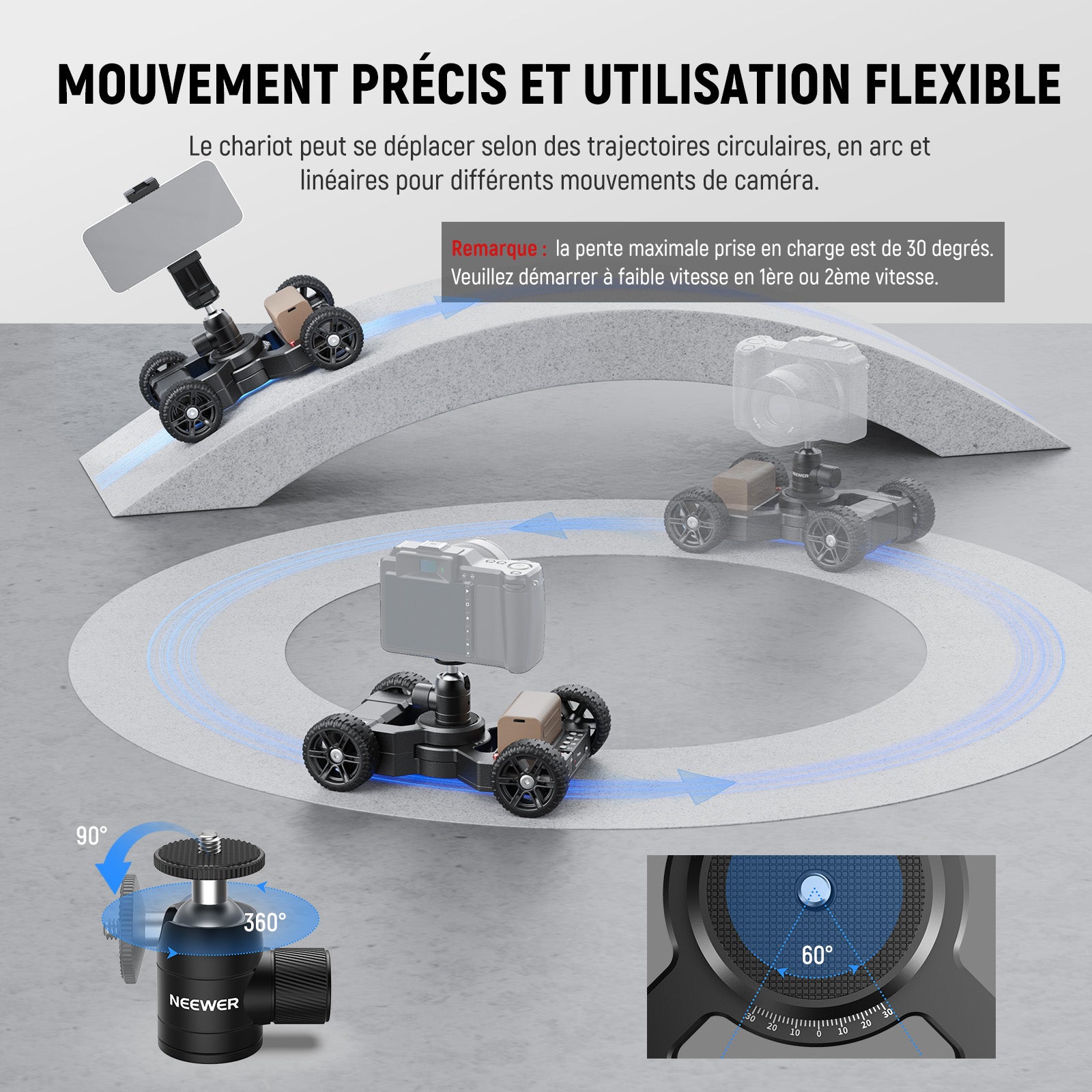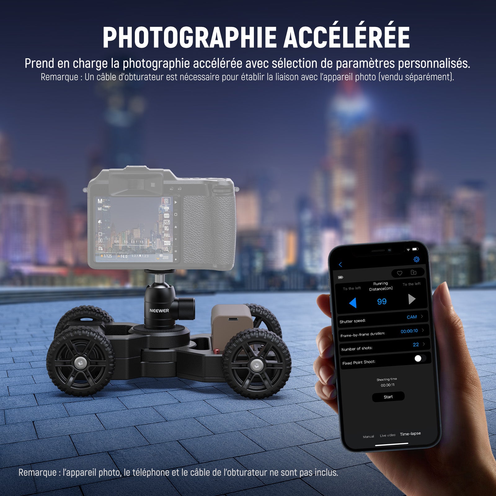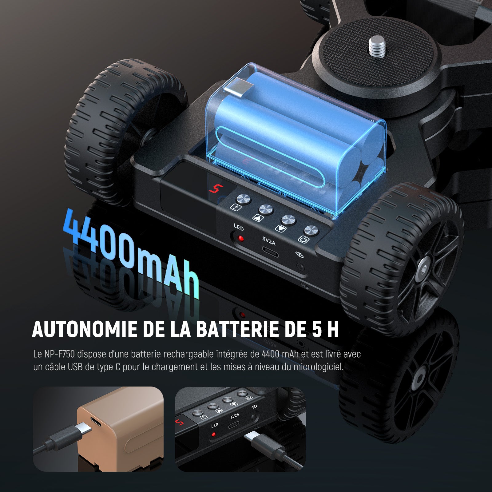 - 【Contrôle mobile intelligent par application】 En utilisant l'application NEEWER, vous pouvez contrôler sans fil le chariot motorisé depuis votre appareil iOS ou Android. Avec les modes Manuel, Vidéo en direct et Time Lapse, vous pouvez personnaliser vos prises de vue et enregistrer des préréglages pour une prochaine utilisation. La batterie rechargeable NP-F750 prend en charge jusqu'à 5 heures d'autonomie et un câble USB de type C pour le chargement et la mise à niveau du micrologiciel