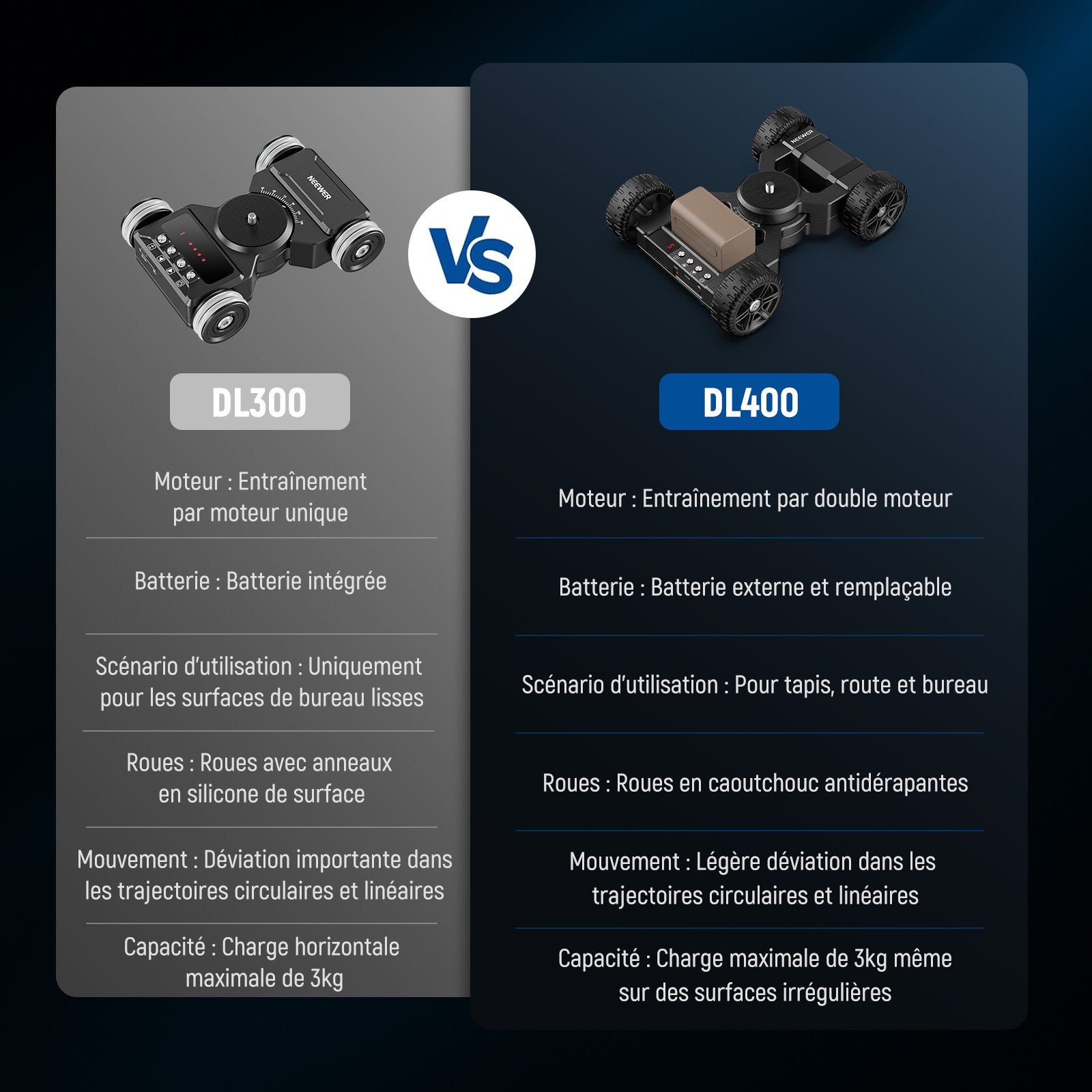 - 【Kit de chariot de caméra motorisé amélioré】 Chariot coulissant de caméra motorisé DL400 met à niveau une conception de moteur double ultra silencieuse et des roues en caoutchouc antidérapantes avec deux roues motrices avant,gère jusqu'à 3kg,assure un mouvement fluide et un enregistrement vidéo ininterrompu (moins de 30 db), et améliore l'adhérence sur la plupart des surfaces.Rotule à 360°,support de téléphone et l'adaptateur de caméra d'action sont tous inclus pour le dessus via une vis 1/4"