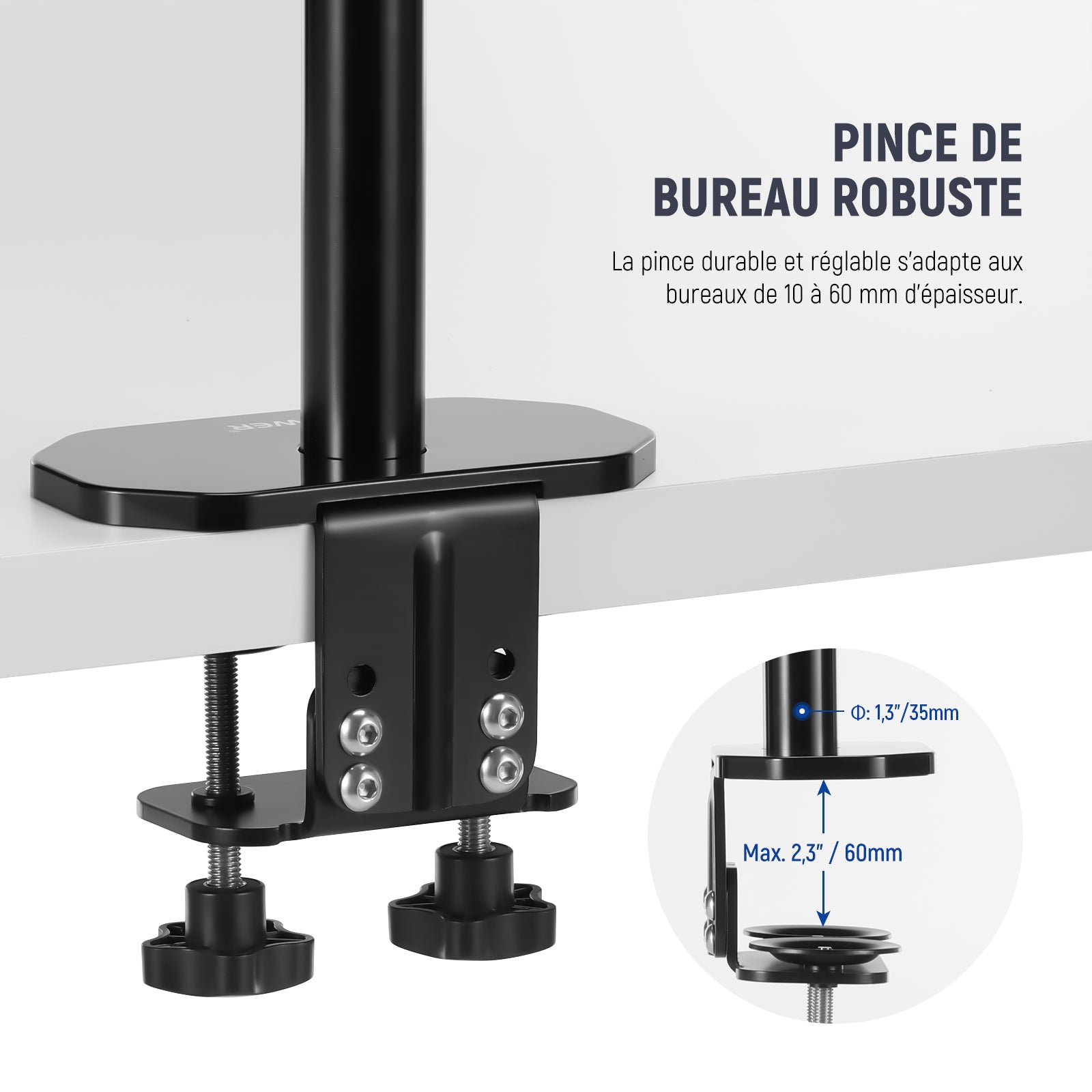 - 【Montage de bureau stable et fiable】 Fabriquée en alliage d'aluminium robuste, la colonne centrale épaissie de 1,4"/35mm assure une durabilité et supporte facilement jusqu'à 17,6 lb/8kg. La pince de bureau réglable de 0,4" à 2,4"/10 à 60mm se fixe solidement bureaux de différentes épaisseurs, avec boutons à double vis pour plus de stabilité