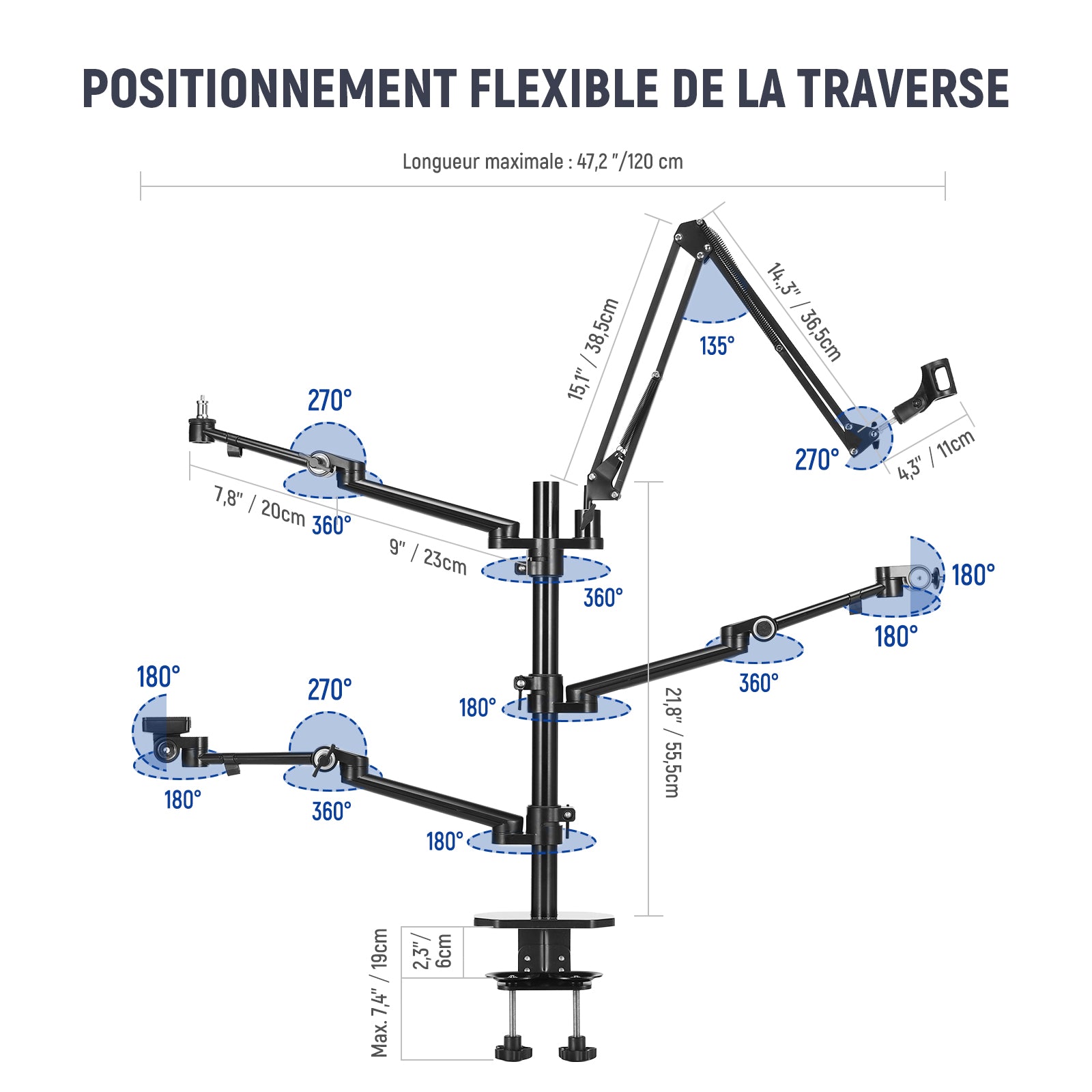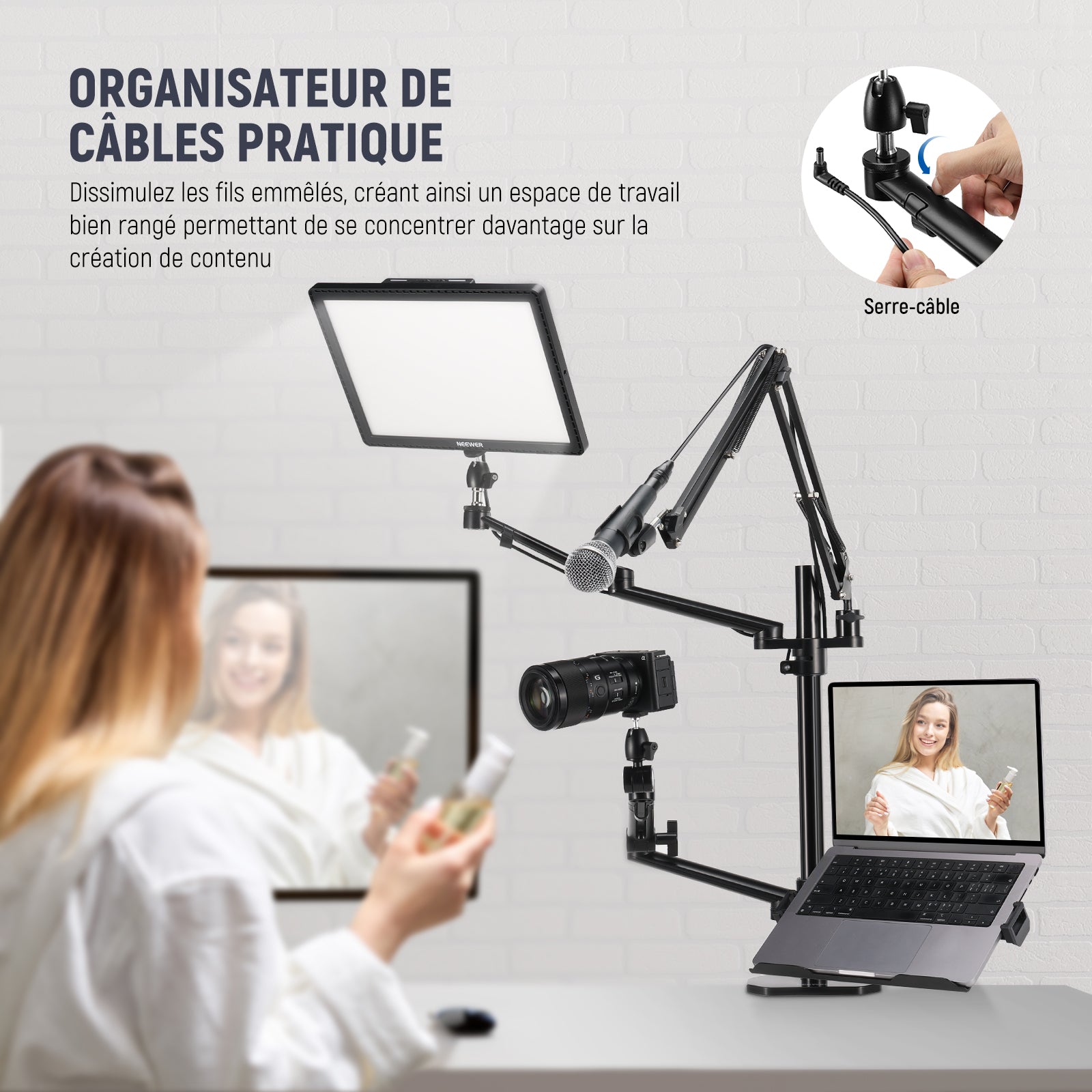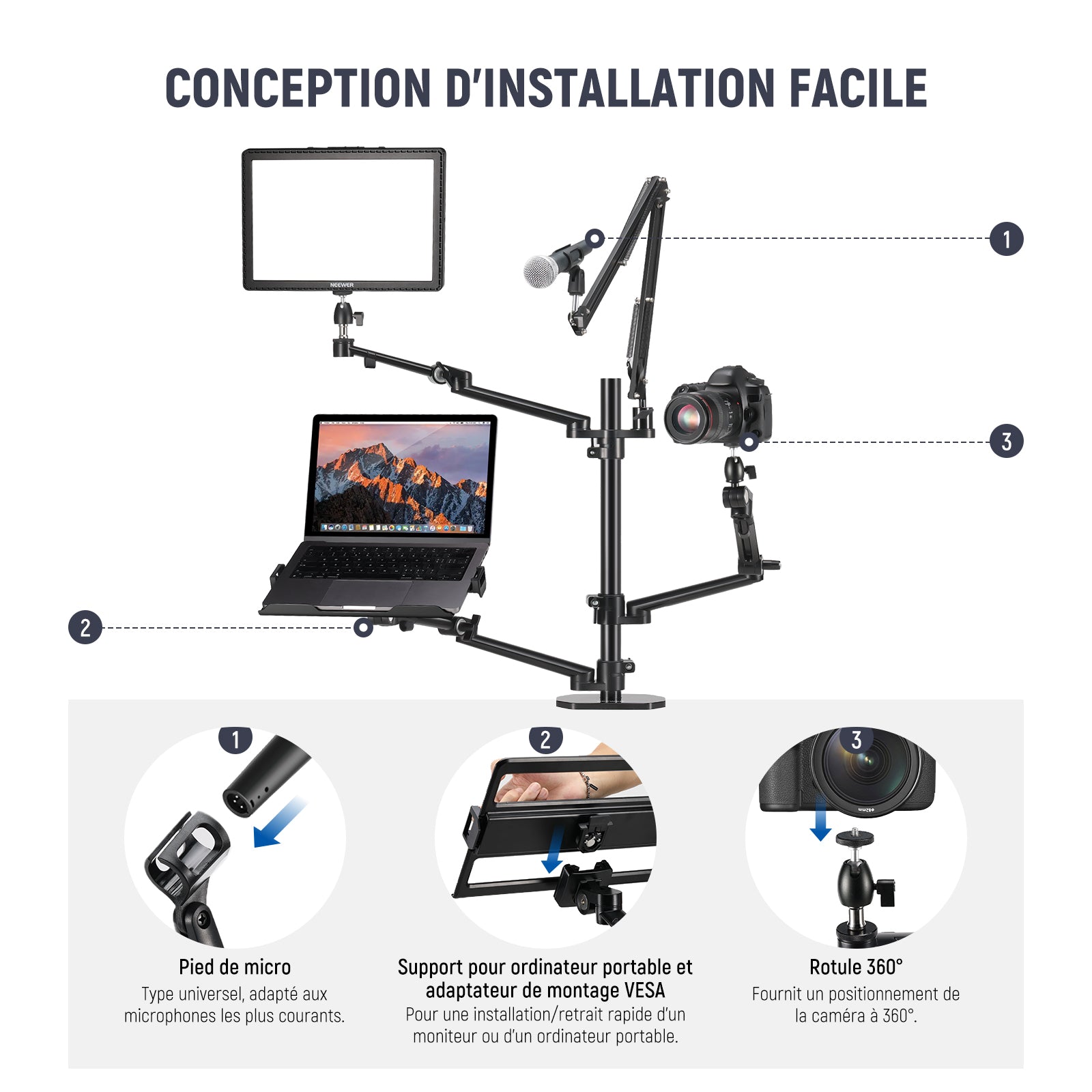 - 【Gain de place et configuration organisée 】 montez en toute sécurité vos appareils sur le bureau, facilitant des réglages faciles en hauteur et en angle. L'organisateur de câbles caché sur le bras du microphone dissimule les fils emmêlés, créant ainsi un espace de travail bien rangé pour se concentrer davantage sur la création de contenu.