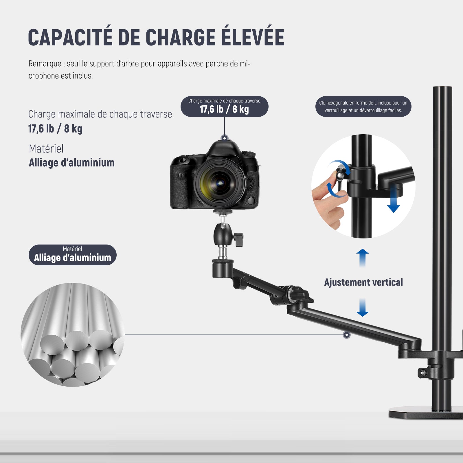 - 【Support de montage pour appareil photo en forme d'arbre de bureau 】 comprend une colonne centrale avec une pince de bureau, trois bras articulés, un bras de microphone, un support à rotule, une pince pour ordinateur portable, une pince pour tablette et un adaptateur de montage VESA, permettant un montage d'un reflex numérique. avec une capacité de charge maximale de 17,6 lb/8kg