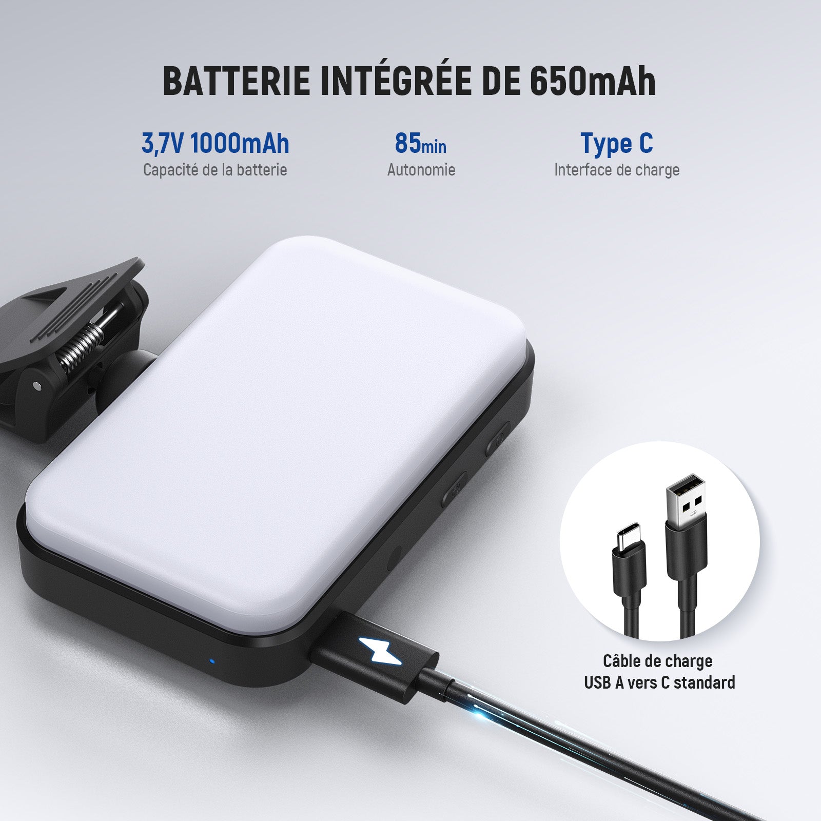 • Capacité de la batterie : 3,7 V 650 mAh 2,4 Wh