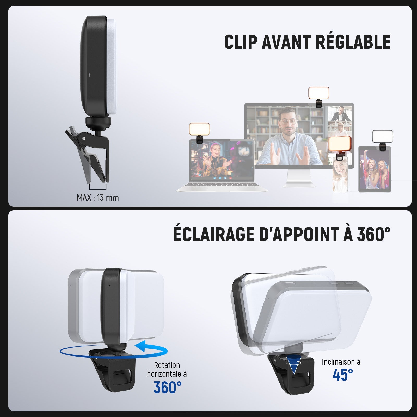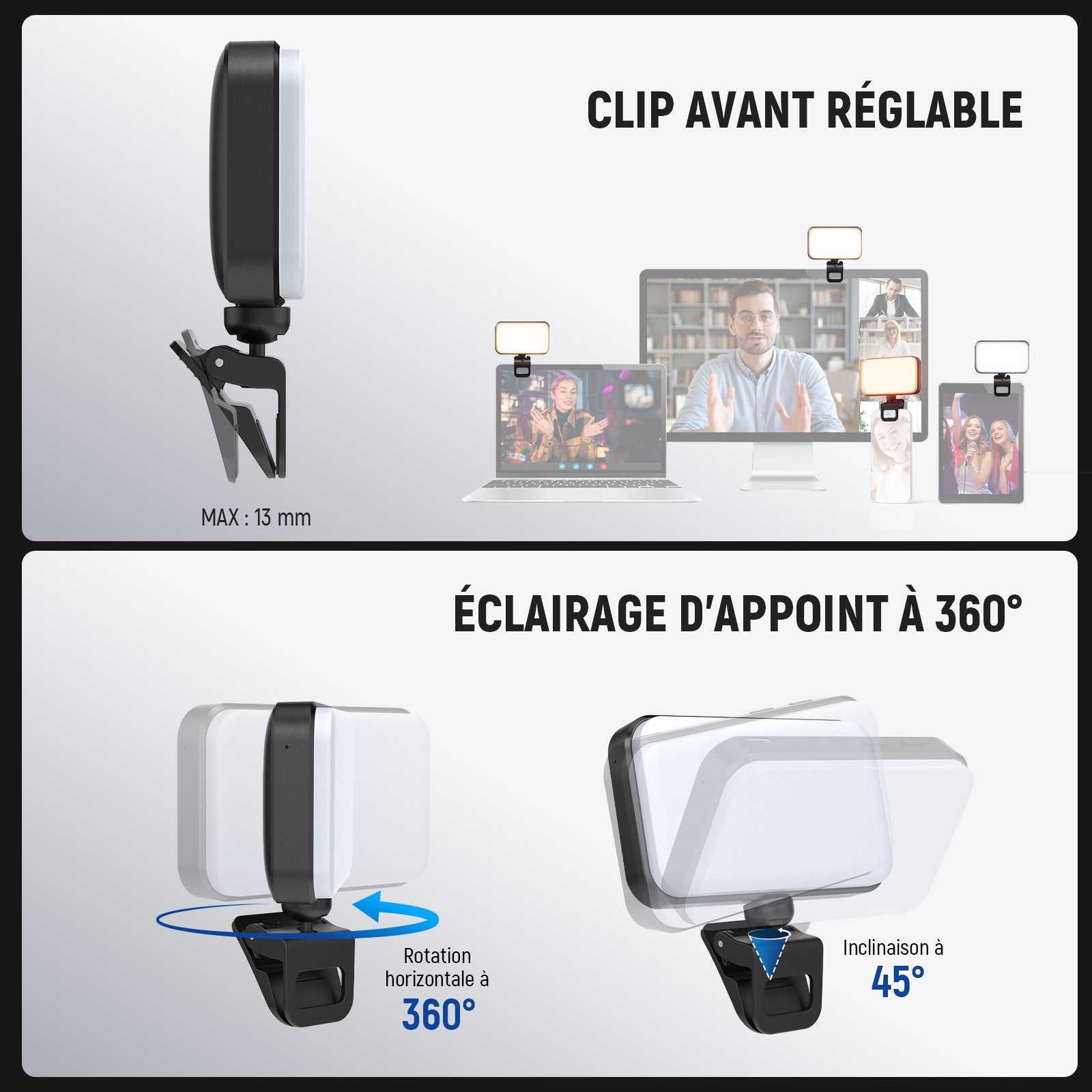 • 【Éclairage de téléphone compact et léger】 Le NEEWER N8 est un éclairage d'appoint doux et haut de gamme, compact(85 x 94 x 18mm)et pesant seulement 55g. Fixez-le sur l'appareil photo d'un téléphone (compatible iPhone),d'un ordinateur portable ou de bureau pour sublimer votre teint et sublimer votre apparence lors de vos selfies,enregistrements de vlogs, visioconférences,diffusions en direct,appels Zoom, etc. La pince est équipée d'une rotule rotative à 360° et inclinable d'avant en arrière.