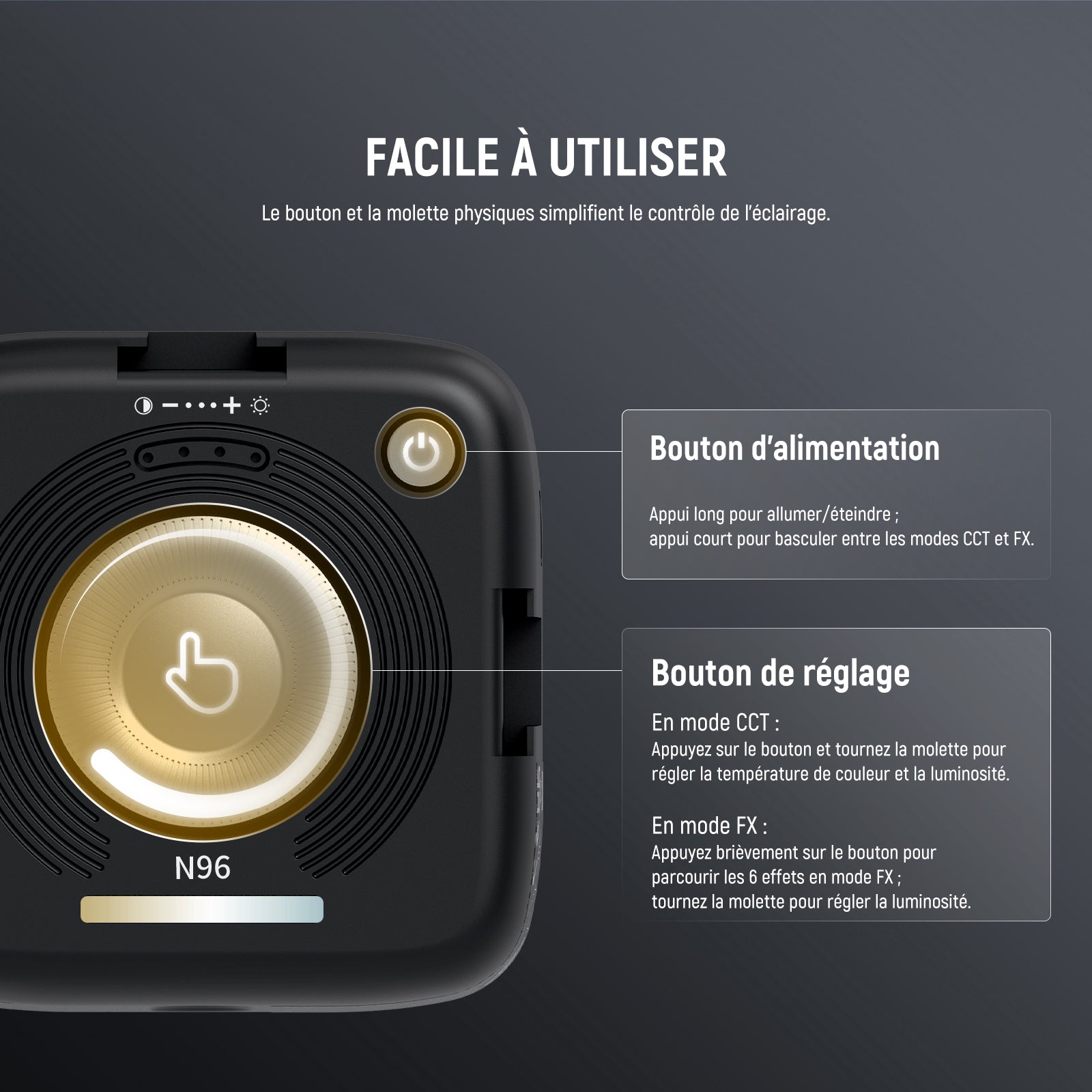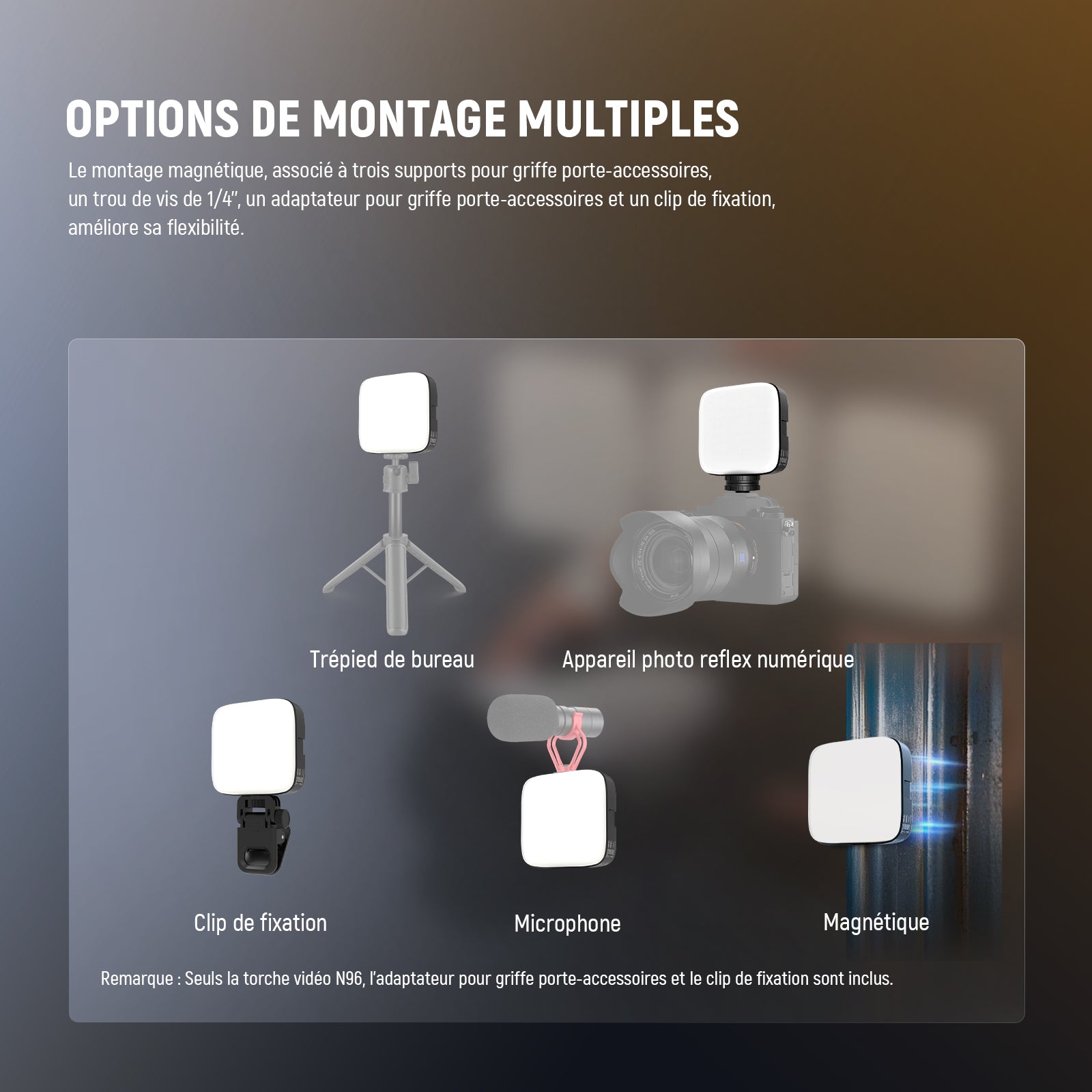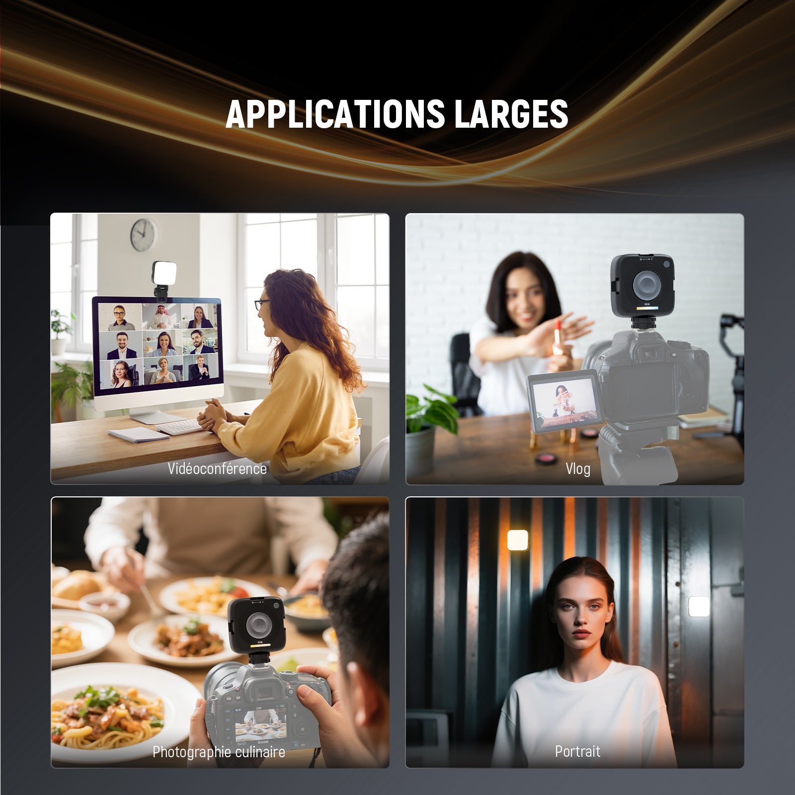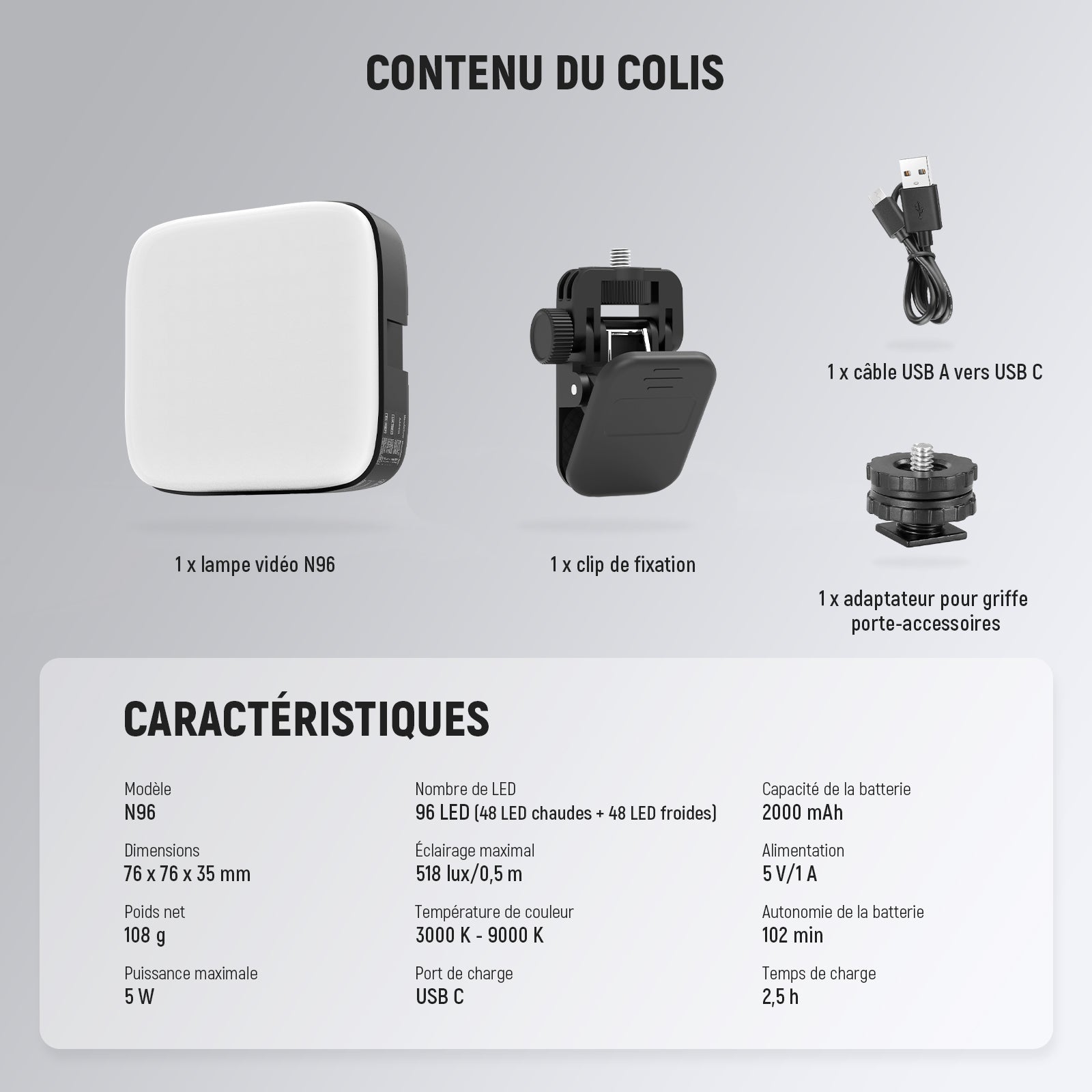 - 【Lampe compacte et portable pour appareil photo】le N96 est un mini panneau lumineux LED de poche pour la photographie d'appareils photo, mesurant 76 x 76 x 35mm, pesant seulement 108g avec le diffuseur. Peut également être fixé sur un ordinateur portable ou fixé magnétiquement pour capturer de beaux moments comme clé ou lumière de remplissage. Le bouton physique simple et le bouton rationalisent le contrôle de l'éclairage, l'équipement essentiel et doivent avoir une lumière selfie pour les créateurs de contenu de médias sociaux, les maquilleurs, les streamers en direct et les influenceurs