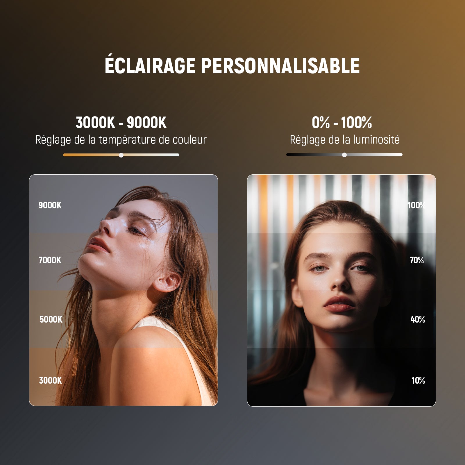 - 【Éclairage personnalisable pour appareil photo】L'équipement d'éclairage LED pour appareil photo dispose de 96 LED de qualité supérieure (48 chaudes + 48 froides) enfermées dans un diffuseur intégré pour fournir un éclairage doux et uniforme jusqu'à 518 lux à 0,5 m. Avec une large plage de température de couleur de 3000 K-9000 K et une luminosité réglable, il s'adapte facilement à une variété de scénarios de prise de vue, y compris les photos de portrait, les séances photo, le tournage, la nature morte, les selfies, les vlogs YouTube TikTok, les films, l'enregistrement vidéo, l'éclairage des touches en direct et la photographie en studio