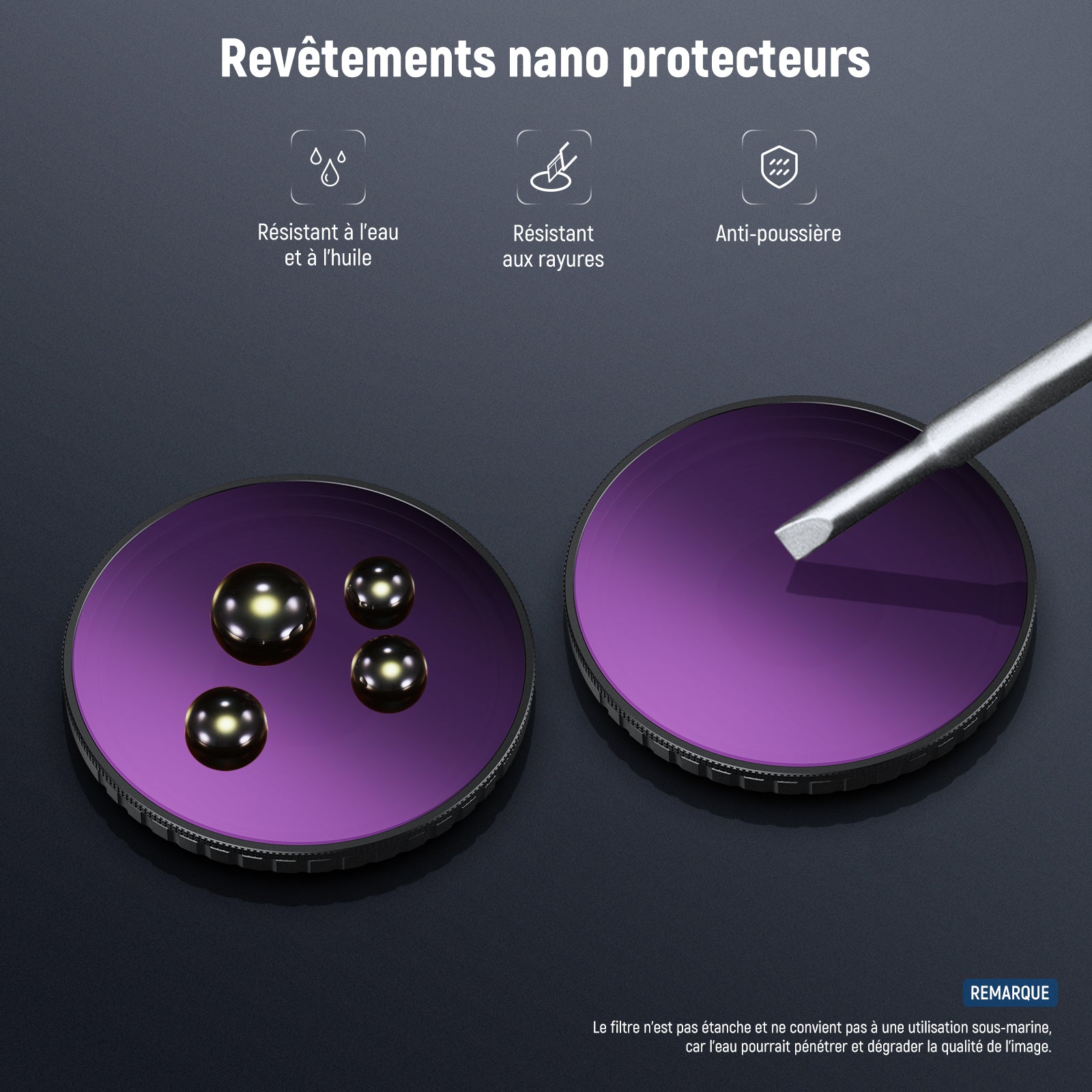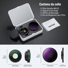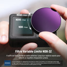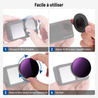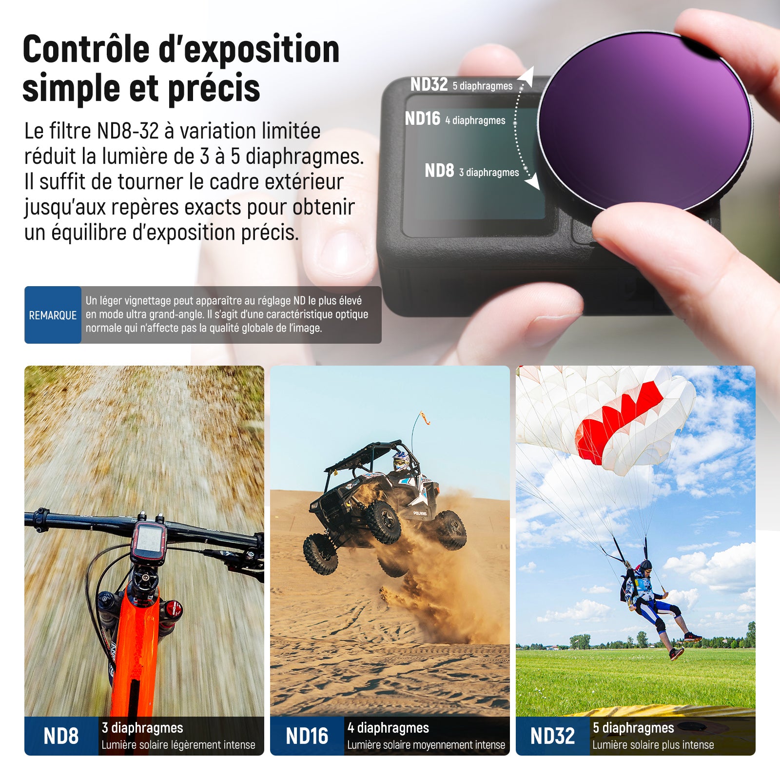 - 【Contrôle d'exposition simple et précis】 Le filtre à densité neutre variable ND8-32 pour caméra d'action réduit la lumière de 3 à 5 diaphragmes pour un contrôle flexible de l'exposition. Tournez le cadre extérieur jusqu'aux repères pour un réglage précis et un flou de mouvement créatif. Remarque : Un léger vignettage peut apparaître avec le réglage ND le plus élevé en mode ultra grand angle. Il s'agit d'une caractéristique optique normale qui n'affecte pas la qualité globale de l'image.