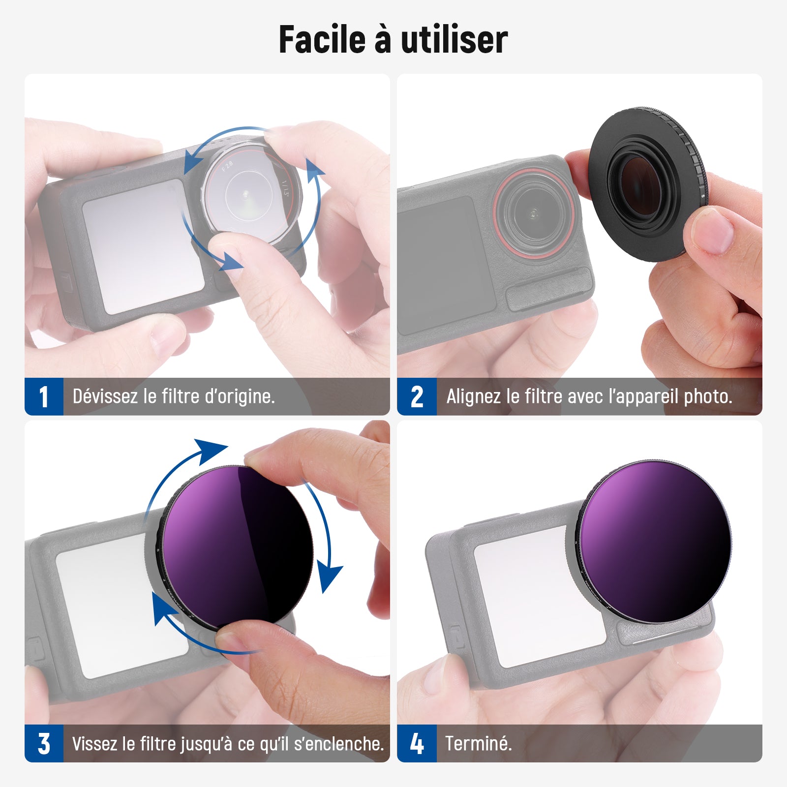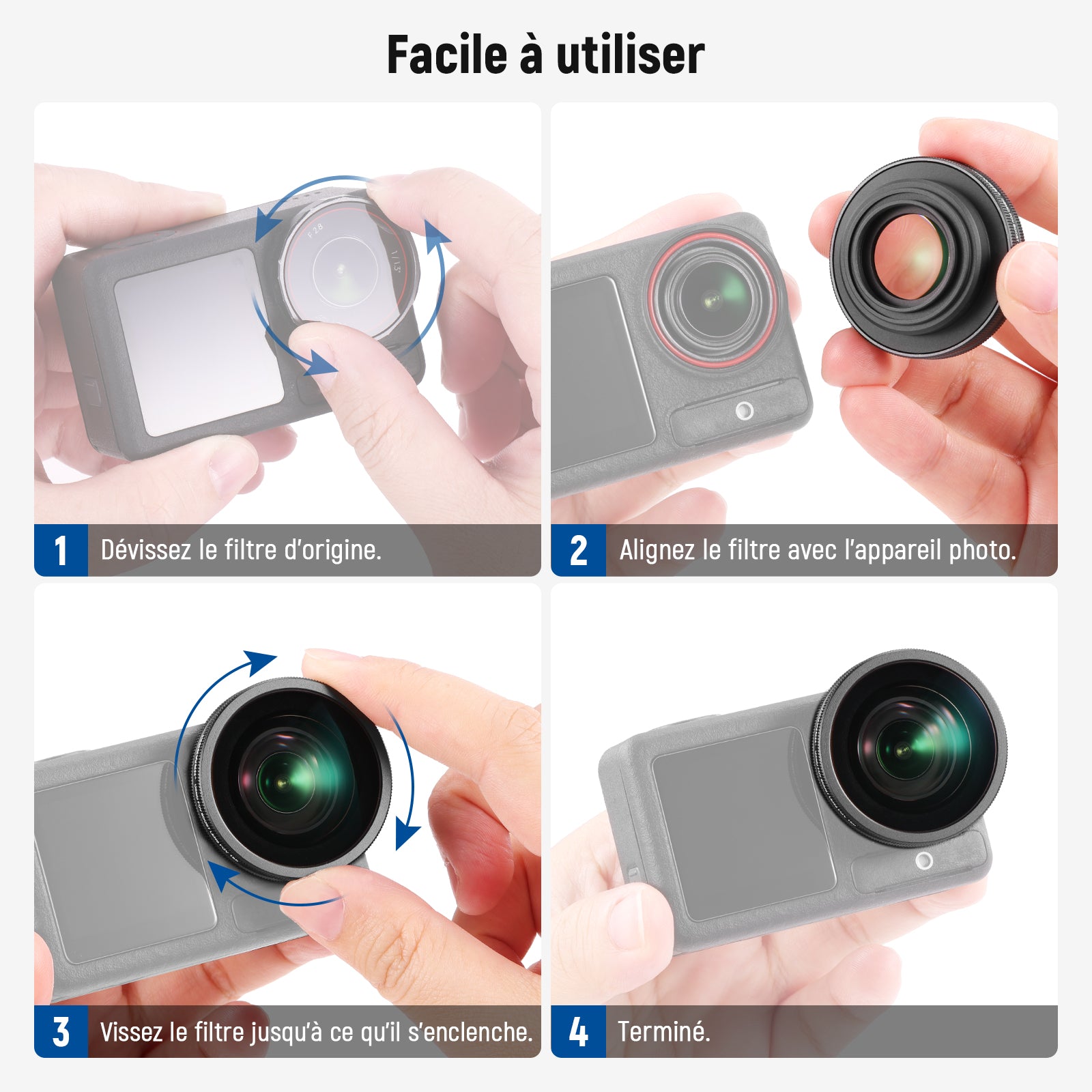- 【Pour Action 5 Pro et Action 4】 Compatible avec DJI Osmo Action 5 Pro et Action 4 Adventure Combo, ce kit 4 en 1 comprend 3 filtres et un objectif pour le surf, le kayak, le ski, le VTT, le parachutisme. Retirez simplement l'objectif d'origine et vissez-le pour une installation rapide et sécurisée.Remarque : Les filtres et l'objectif ne sont pas étanches et ne sont pas conçus pour une utilisation sous-marine,car l'eau pourrait pénétrer et dégrader la qualité de l'image.