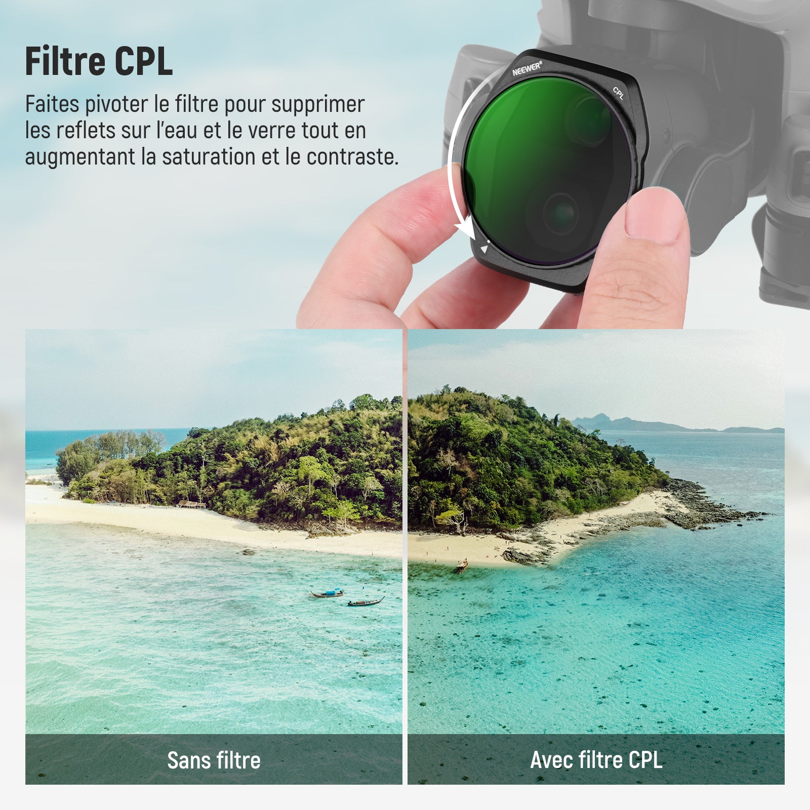 • Améliore la saturation/le contraste : le filtre CPL (polarisation circulaire) minimise la réflexion sur les surfaces non métalliques, telles que le verre et l'eau, et améliore la saturation et le contraste pour des couleurs vives