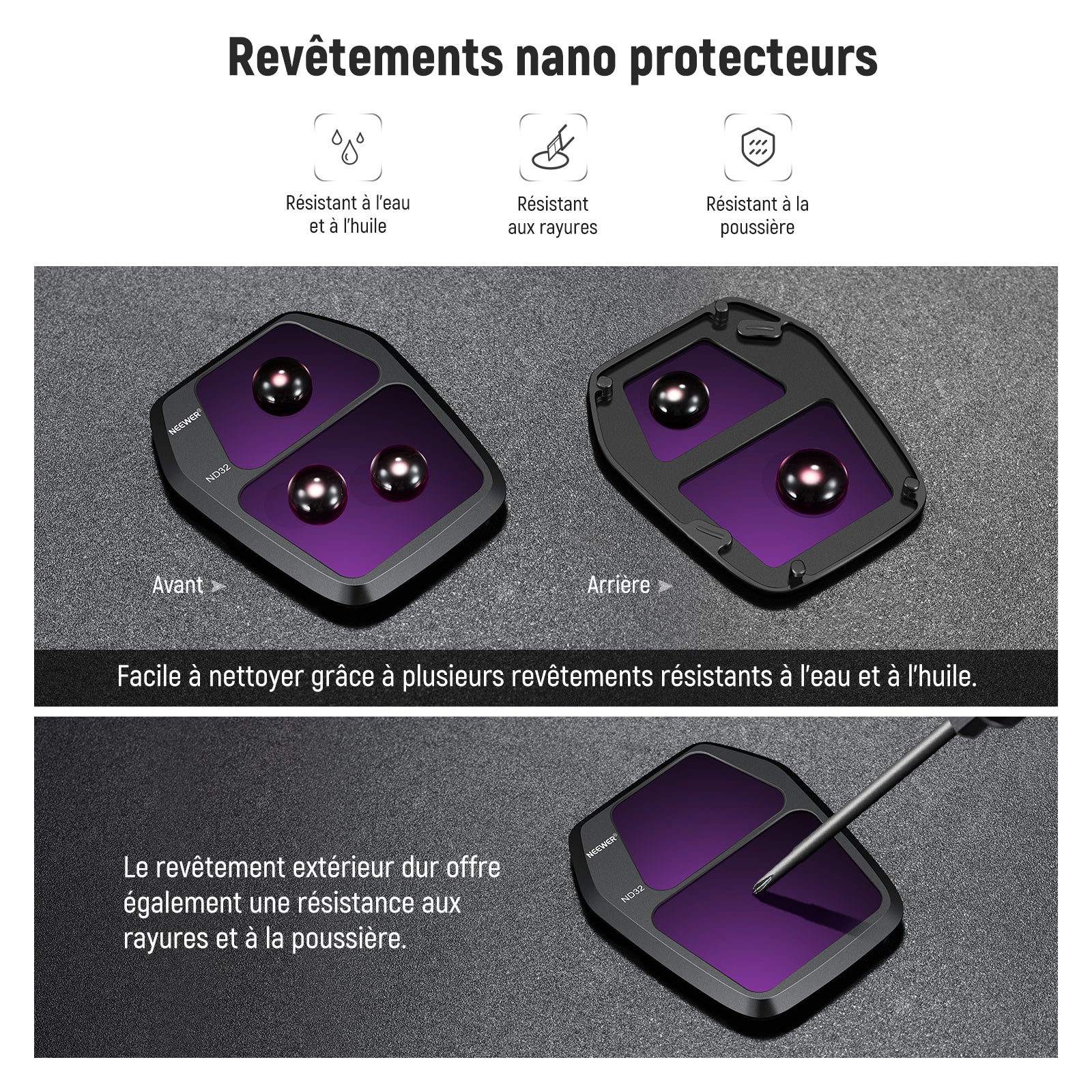 • Verre optique HD multicouche : le verre optique HD garantit une grande clarté et une reproduction précise des couleurs. Plusieurs revêtements sur les deux côtés du verre sont résistants à l'eau, aux traces de doigts, aux taches et aux rayures, ce qui rend les filtres faciles à nettoyer