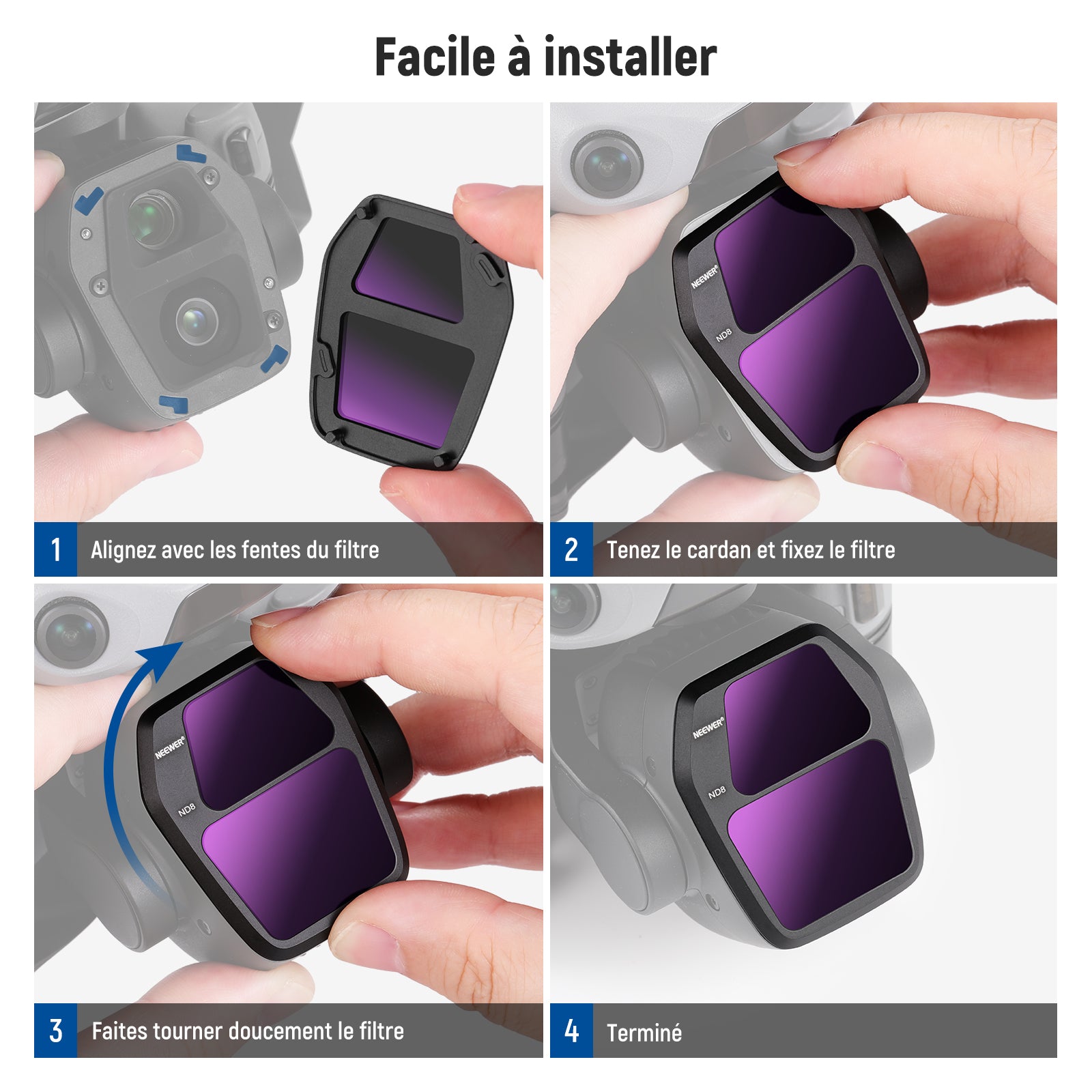 • Installation sécurisée : retirez la lentille de protection existante. Alignez les languettes de montage du filtre avec les fentes de la caméra à cardan, puis tournez doucement pour le fixer. Cela garantit un ajustement ferme et stable pour un tournage fluide sans affecter l'étalonnage du cardan