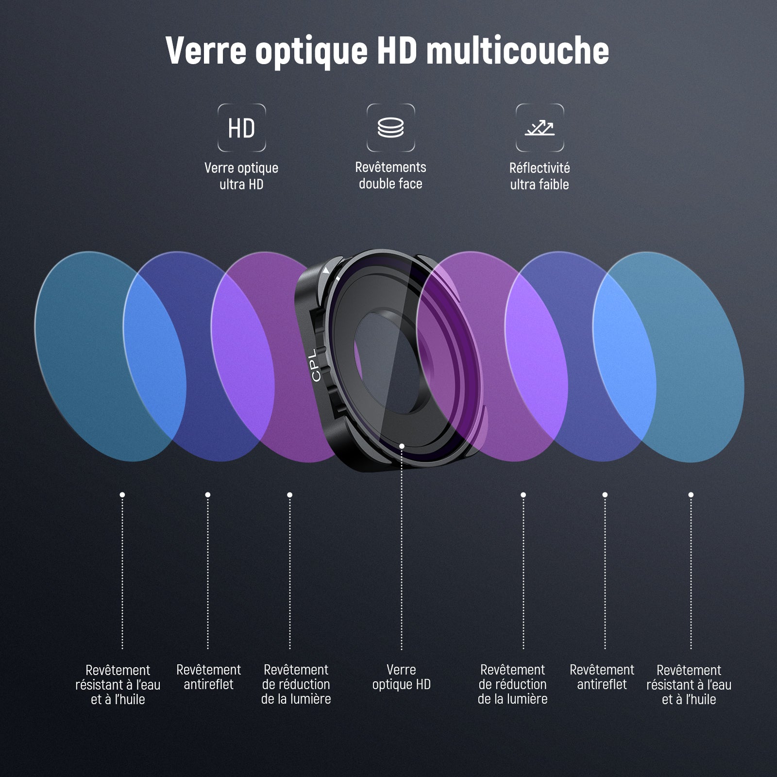- Verre optique HD multicouche : le verre optique HD offre une clarté et une fidélité des couleurs exceptionnelles. Les revêtements multiples des deux côtés sont résistants à l'eau, aux traces de doigts, aux taches et aux rayures, assurant une grande durabilité et un nettoyage facile lors de la prise de vue en plein air