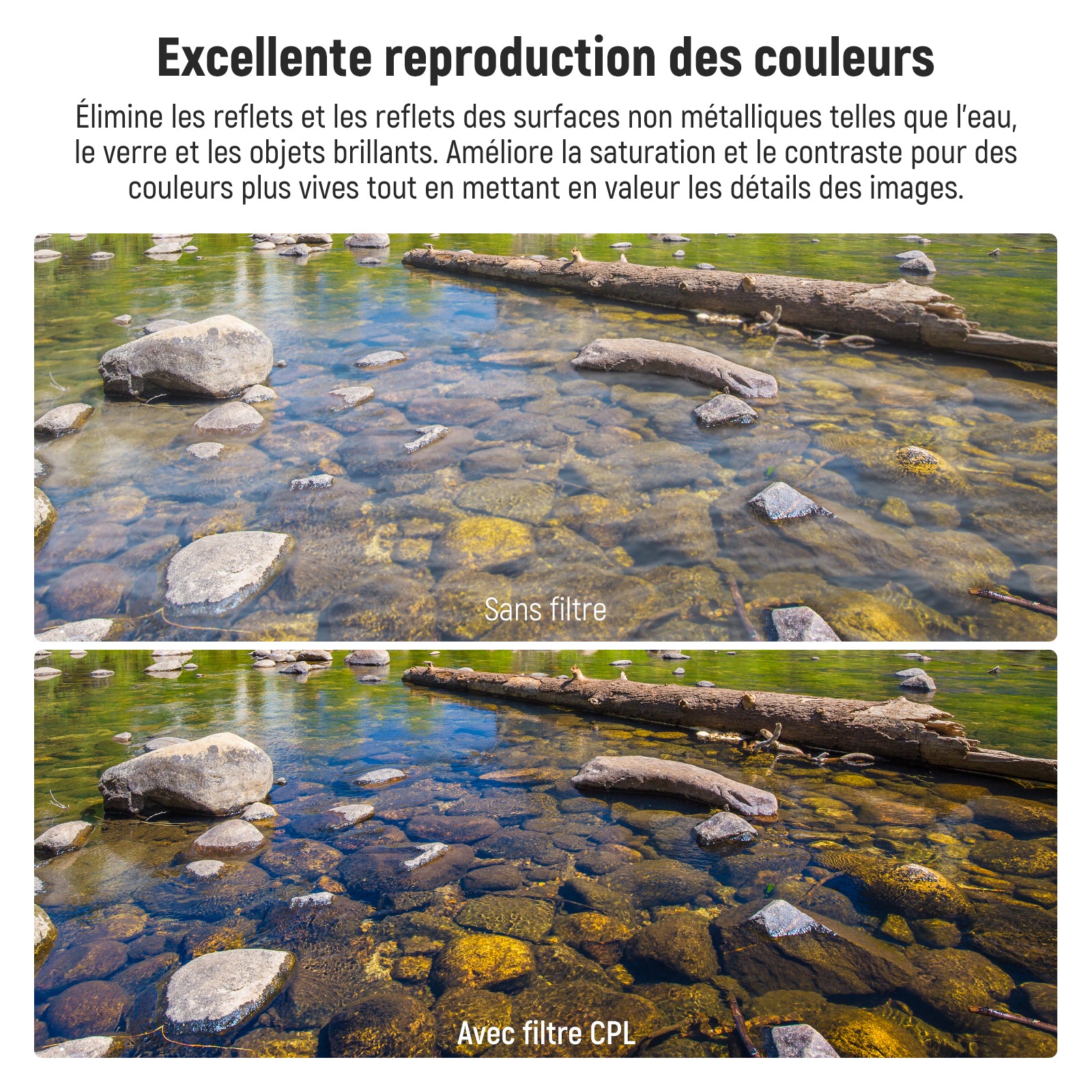 - Réduit les reflets indésirables : élimine l'éblouissement et les reflets des surfaces non métalliques telles que l'eau, le verre et les objets brillants