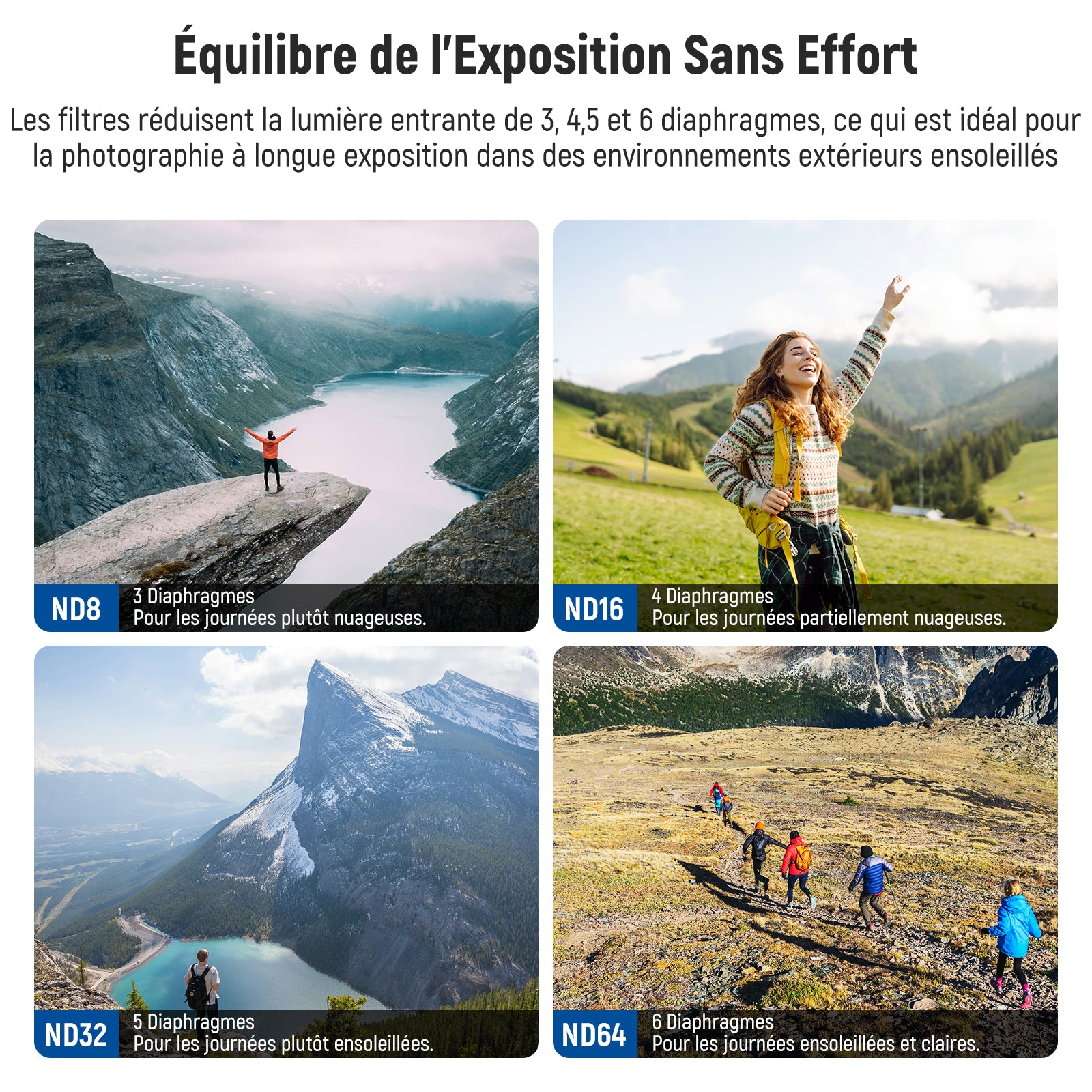 - 【Équilibre de l'Exposition Sans Effort】 Les filtres ND8, ND16, ND32 et ND64 réduisent respectivement la lumière de 3, 4, 5 et 6 diaphragmes, convenant à la photographie de longue exposition dans des conditions extérieures lumineuses. Ils vous permettent de prendre des photos à des vitesses d'obturation plus lentes avec des ouvertures plus grandes et de capturer des mouvements avec des effets de flou de mouvement expressifs