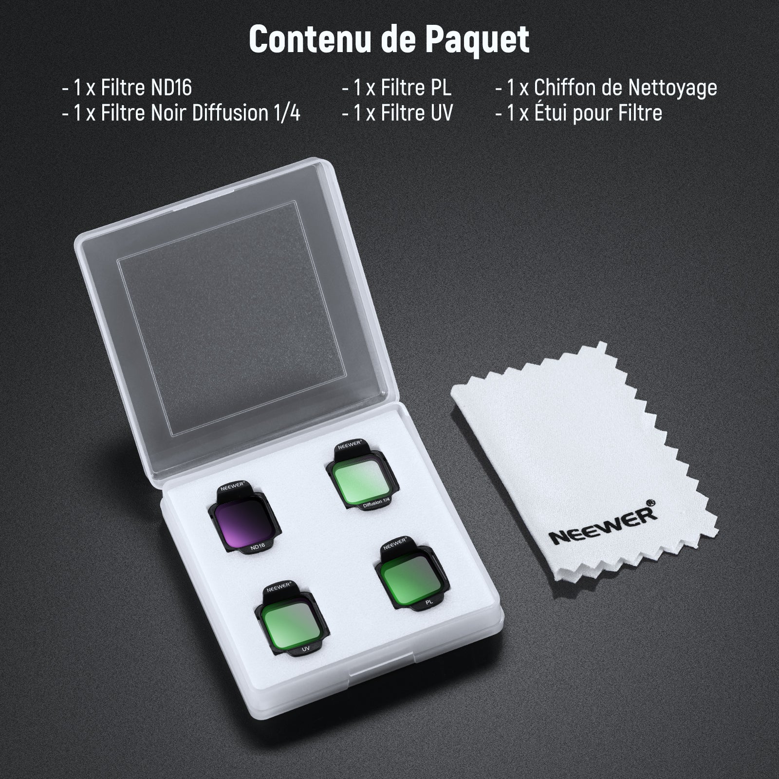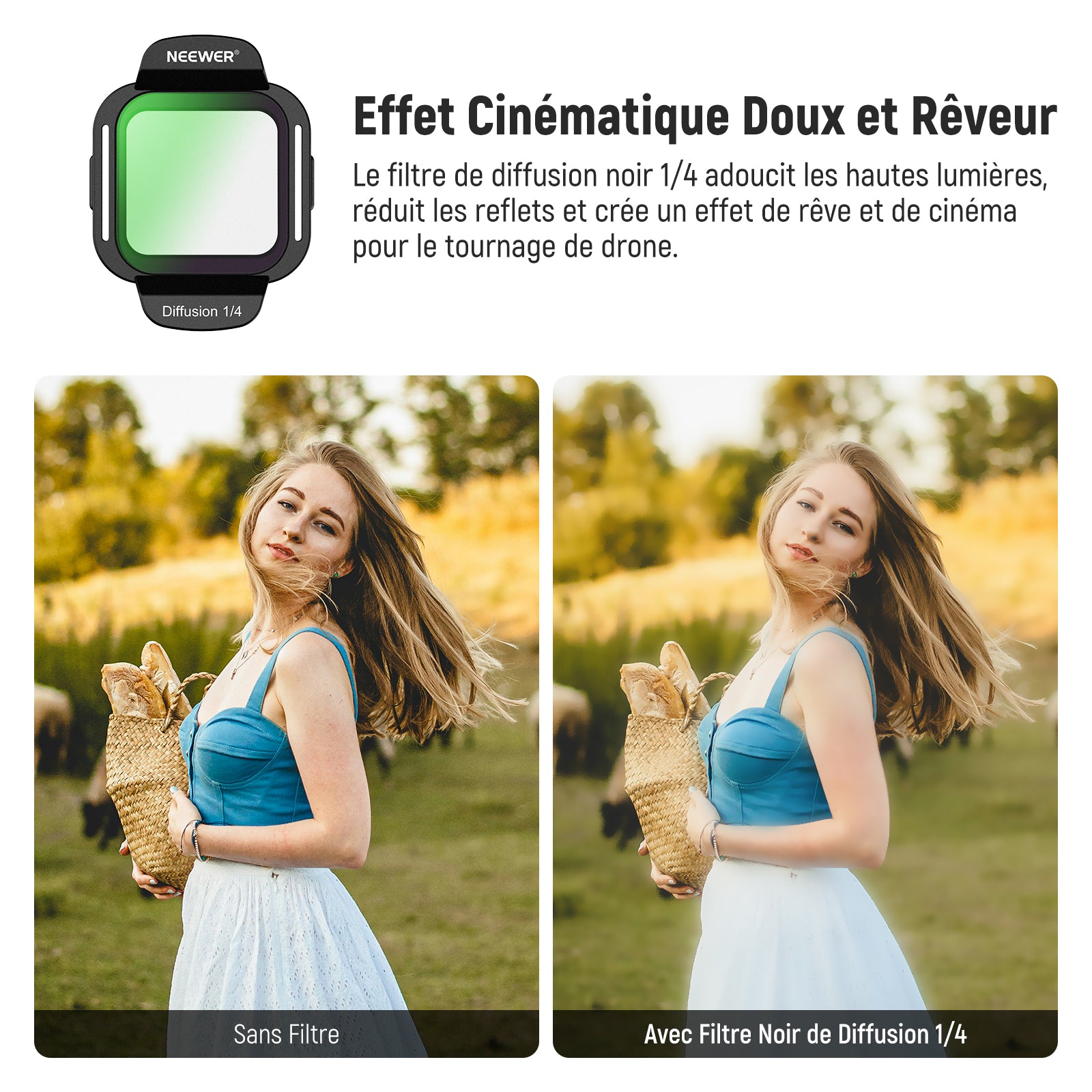 - 【Effet cinématographique doux et rêveur】 Le filtre à diffusion noir de 1/4 adoucit les hautes lumières, réduit les reflets et crée un effet rêveur et cinématographique pour les prises de vue avec les drones