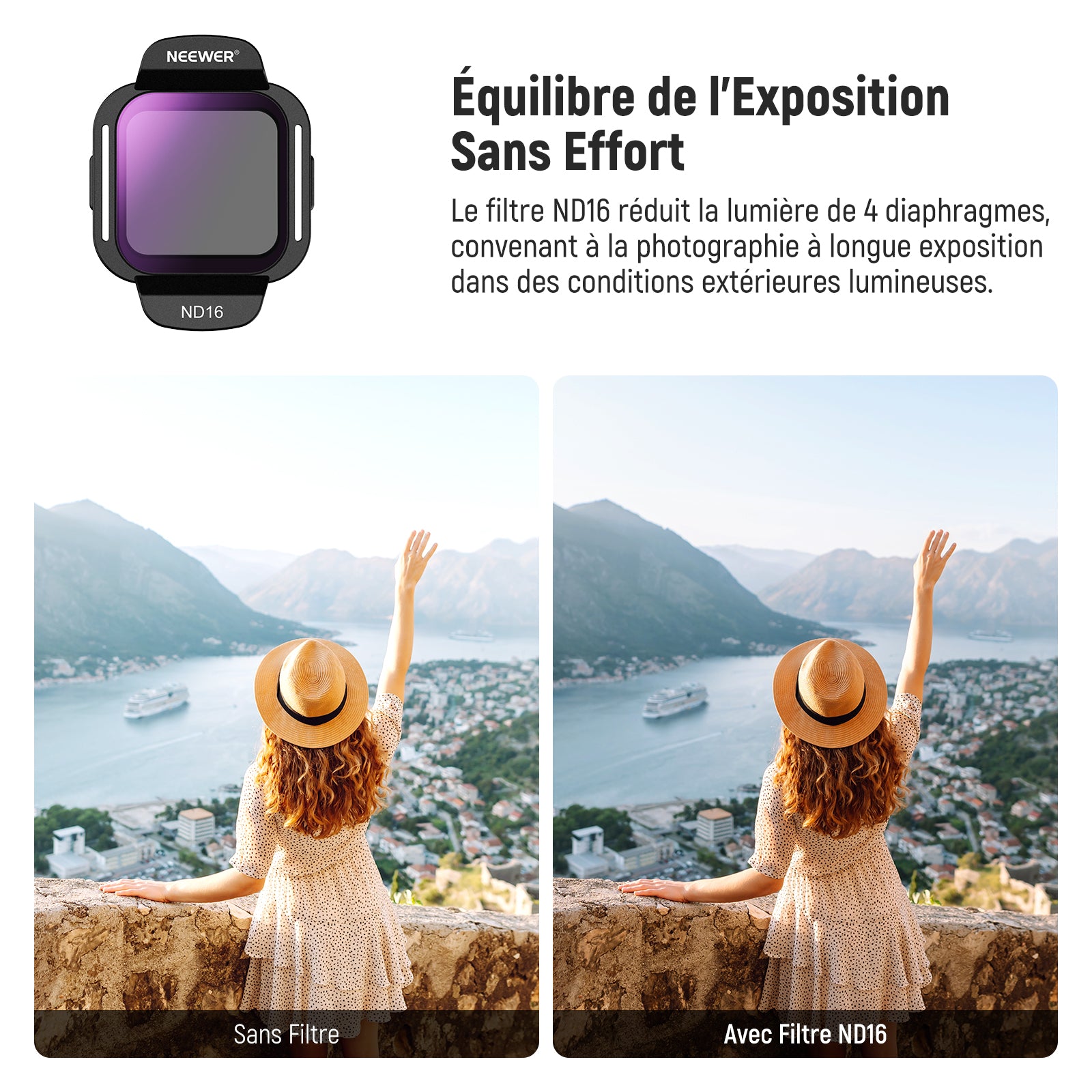 - 【 Balance d'exposition sans effort 】 Le filtre ND16 réduit la lumière de 4 stops, adapté pour la photographie longue exposition dans des conditions lumineuses en plein air. Permet de prendre des photos avec des temps de pose plus longs avec des ouvertures plus larges et de capturer les mouvements avec des effets de flou expressifs