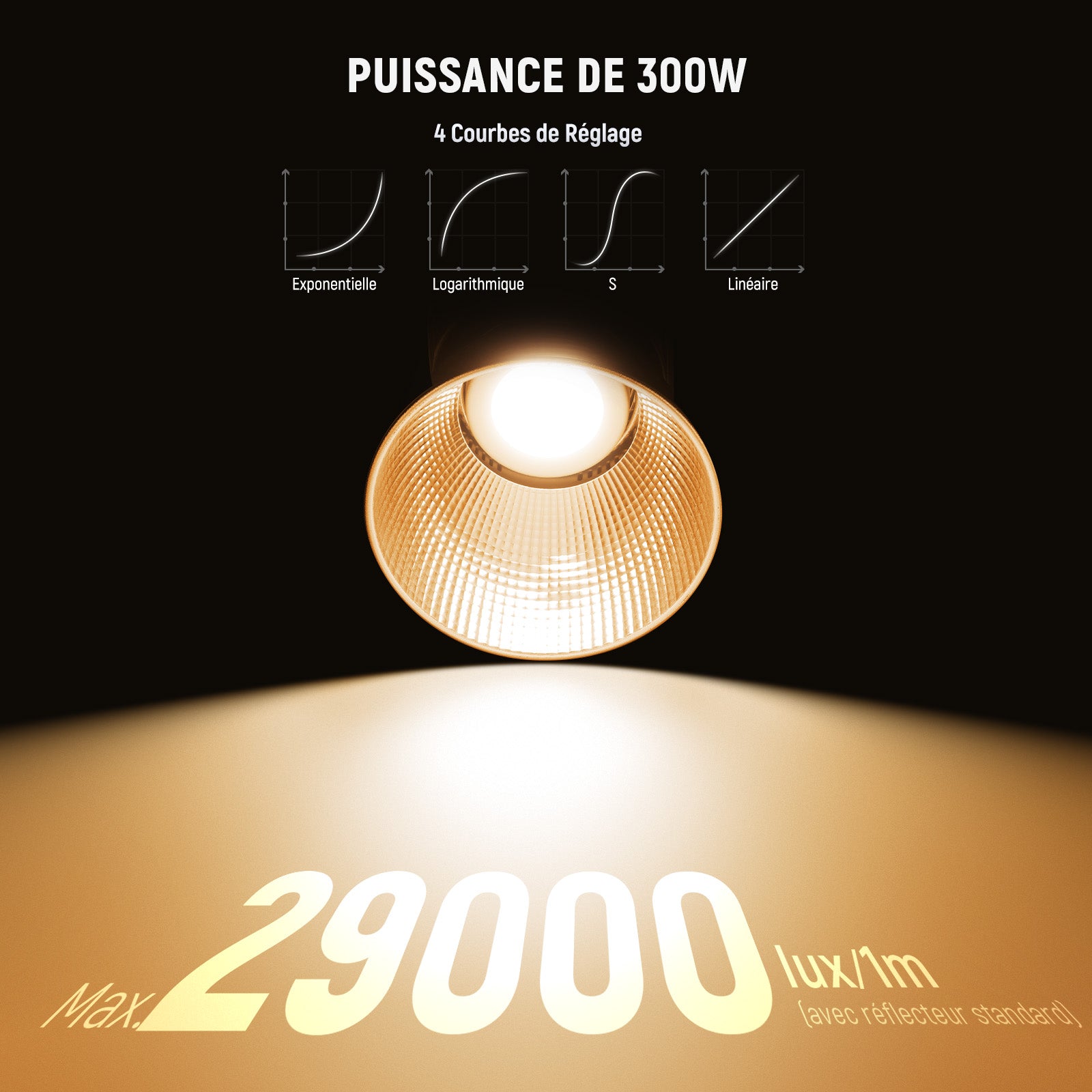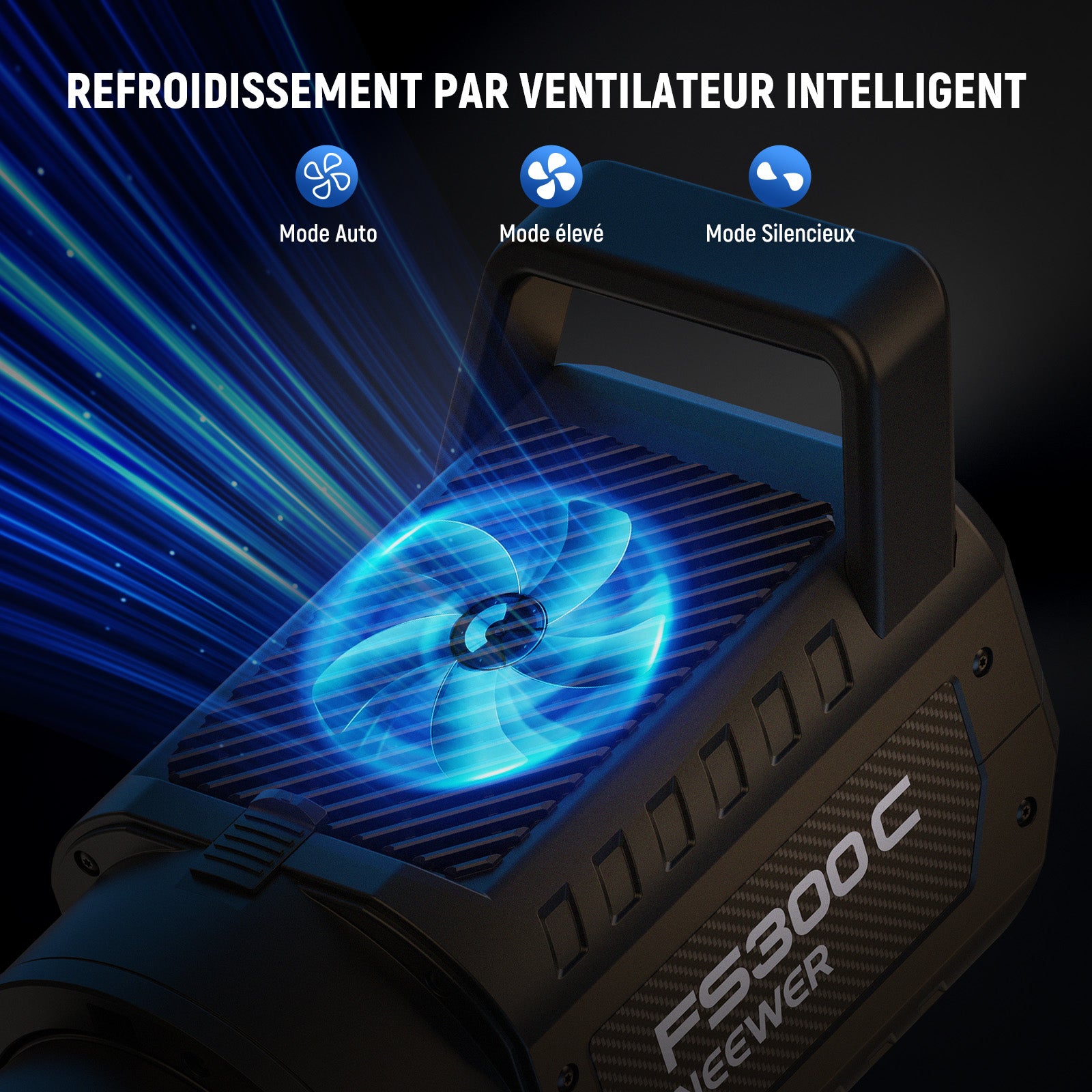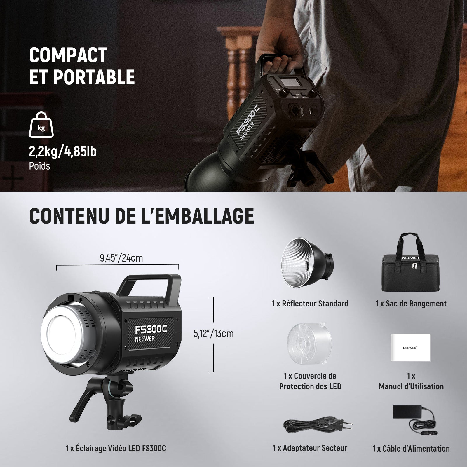 - 【Éclairage Vidéo COB 300W】 L'éclairage LED RGB FS300C utilise des LED COB premium et une technologie optique pour une super luminosité de 300W sans scintillement. Utilisé avec le réflecteur inclus, il fournit un éclairement jusqu'à 29000lux/1m pour les photos en studio. Réglage de l'angle de 0 à 180° grâce à l'adaptateur de montage pour trépied. Il mesure 240x195x130mm et pèse 2,2kg. Éclairage compact et portable pour les portraits, les interviews, les vidéos YouTube/TikTok, le streaming…